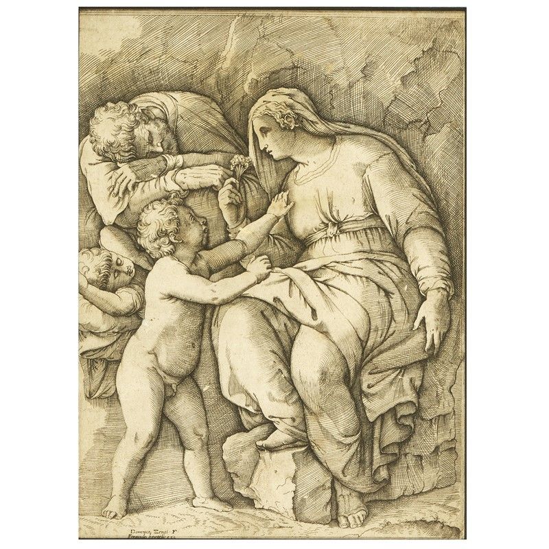 THE HOLY FAMILY WITH SAINT JOHN THE BAPTIST engraving, laid paper, mm 250x185 signed on the plate "Domenico Zenoi F."