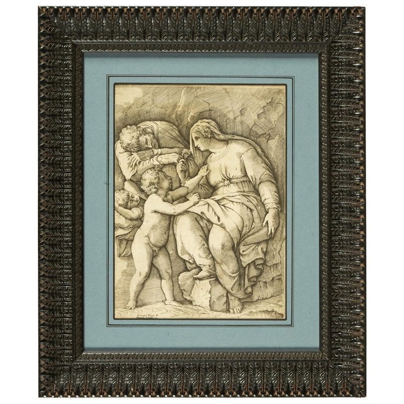 Domenico Zenoi da Battista Franco (attivo a Venezia e Padova, 1560 -1580) SACRA FAMIGLIA CON SAN GIOVANNINO incisione a bulino, carta vergellata, mm 250x185 firmata sulla lastra in basso "Domenico Zenoi F."