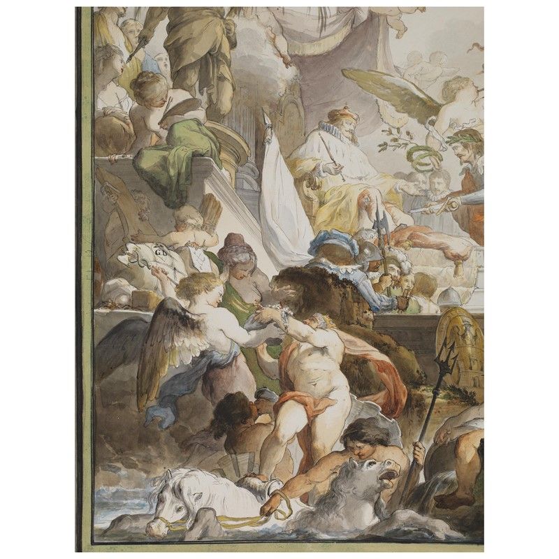 L'affollata composizione raffigurata su questo straordinario acquerello testimonia la partecipazione di Giovanni David al concorso indetto nel 1782 per la decorazione di volta della Sala del Maggior Consiglio del Palazzo Ducale di Genova. Il rifacimento delle decorazioni del palazzo, distrutte da un incendio nel 1777, fu deliberato dalle autorità cittadine che nell’aprile del 1778 invitarono finanziatori privati a sostenere il progetto. La famiglia Giustiniani raccolse tale invito bandendo un concorso il 13 agosto 1782: i progetti dovevano misurare 50 palmi in lungo e 19 palmi in larghezza. Parteciparono al concorso 15 artisti i cui bozzetti furono esposti nell’agosto 1783 nel Chiostro di Santa Maria di Castello per 12 giorni. La candidatura di David, caldeggiata da Charles de Wailly, non valse all’artista la selezione fra i tre finalisti che la giuria, composta da alcuni membri di casa Giustiniani, dal doge Airoli e i pittori Antonio Villi e Giambattista Gnecco, individuò in Giovanni Cristoforo Unterberger, James Durno e Giandomenico Tiepolo.