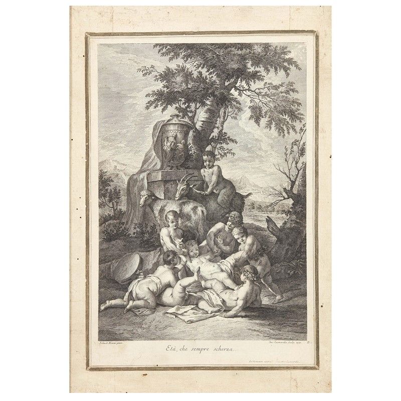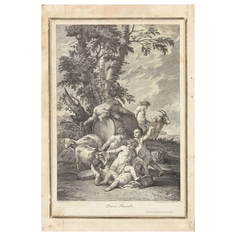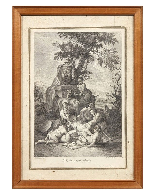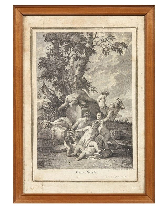 Jacopo Leonardis da Sebastiano Ricci (Palmanova, 1723 - Venezia, 1797) ETA' CHE SEMPRE SCHERZA BACCO FANCIULLO coppia di stampe, acquaforte, carta vergellata applicata su tela, mm 410x270 (totale mm 490x340) (2)