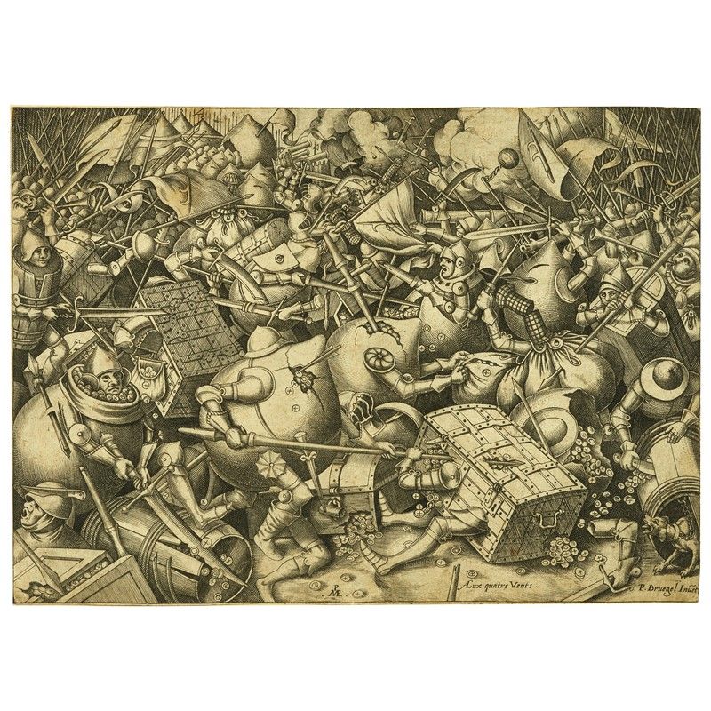 THE BATTLE OF THE MONEY BAGS AND STRONG BOXES engraving on laid paper, mm 222x308 lettered engraver's monogram, "Aux Quatre Vents." and "P. Bruegel Invet" lower edge