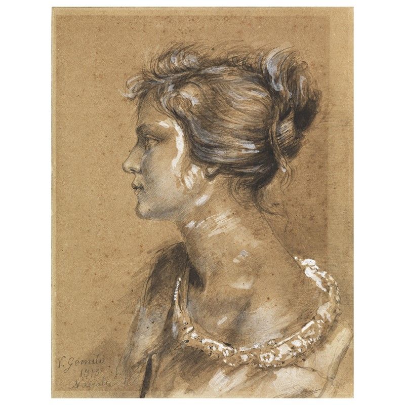 Vincenzo Gemito (Napoli 1852 - 1929) VOLTO DI DONNA DI PROFILO matita, china e biacca su cartoncino, mm 230x180 firmato e datato "1913 Napoli" in basso a sinistra