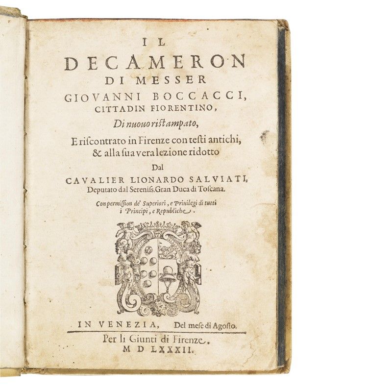 BOCCACCIO, Giovanni - SALVIATI, Leonardo. Il Decameron di Messer Giovanni Boccacci cittadin fiorentino, di nuovo ristampato, e riscontrato in Firenze con testi antichi, e alla sua vera lezione ridotto dal Cavalier Lionardo Salviati. In Venezia, per li Giunti di Firenze, 1582.