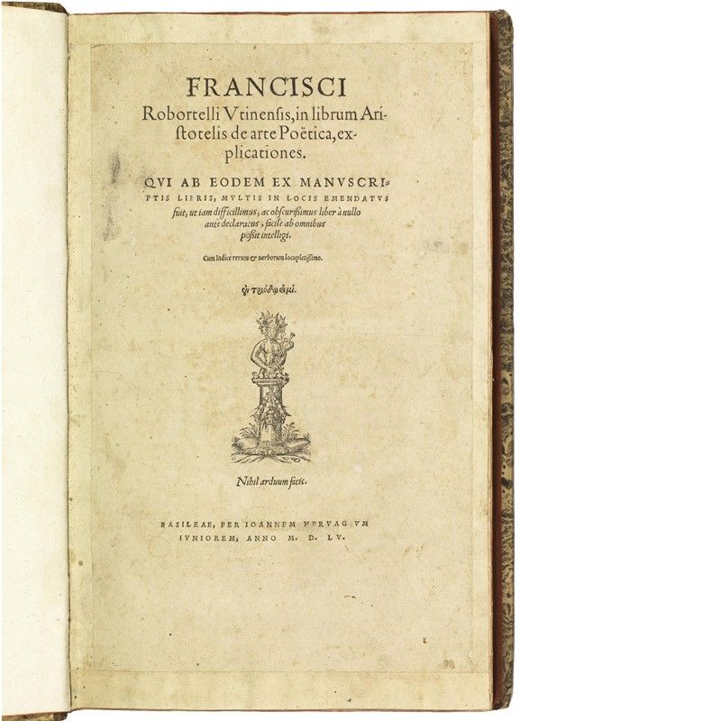 In folio (330 x 216 mm) in 2 parti: [12] 281 [15] pp. e [2] 48 [6] pp. Testo di Aristotele in greco e latino; titolo della parte 2: Paraphrasis in librum Horatii, qui vulgò De arte poetica ad Pisones inscribitur. Marca tipografica al frontespizio, iniziali xilografiche. Mezza pelle settecentesca con tassello al dorso, tagli rossi. Occasionali postille di mano antica. -- Frontespizio ritagliato e controfondato, pallida gora marginale alle prime ed altre carte, occasionali bruniture e fioriture.
