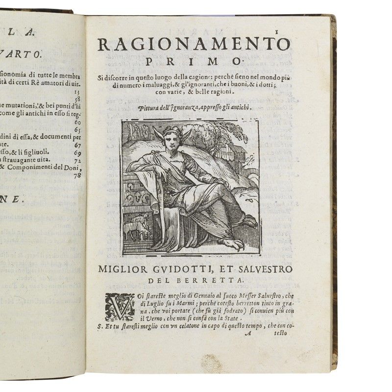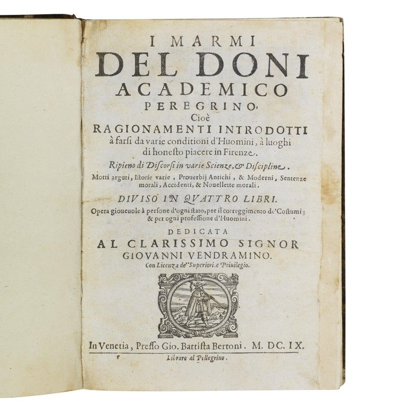 PRIMA EDIZIONE del Libro dell’eloquenza, rilegato con i famosi Marmi e con il Libro della memoria. Sono tutte opere di dialoghi bizzarri. Nei Marmi, il Doni finge di essere stato tramutato in un uccello, libero di volare e di ascoltare le conversazioni di chi si raduna, per chiacchierare, sui “marmi”, le scalinate in marmo del Duomo di Firenze. Include una dissertazione sull’ignoranza presso gli antichi (con immagine di antico romano con orecchie d’asino), due pazzi che discorrono d’astrologia, un discorso sui titoli dei libri “i quali se non sono curiosi, non hanno esito”, uno scambio di idee su una “moglie fastidiosa, e superba, la quale pretendea superiorità con l’huomo”, motti e burle, scambi di idee su traduttori e compositori dei libri, la burla del pesce marinato e dei maccheroni, disquisizioni contro gli uomini effeminati, sulla chiromanzia, fisionomia, ecc. Il libro della Memoria è una raccolta di aneddoti relativi agli antichi e ai moderni (incluso uno su Dante), mentre il libro dell’Eloquenza affronta una grande varietà di argomenti, incluso il “Fine del leggere”: “I buoni libri non sono scritti per passare il tempo leggendogli, né si debbono usare per istratiare il tempo; ma per gouernarsi nelle fortune felici et infelici a tempo. Leggere et intendere è da huomo, leggere et non intendere è da animale.”