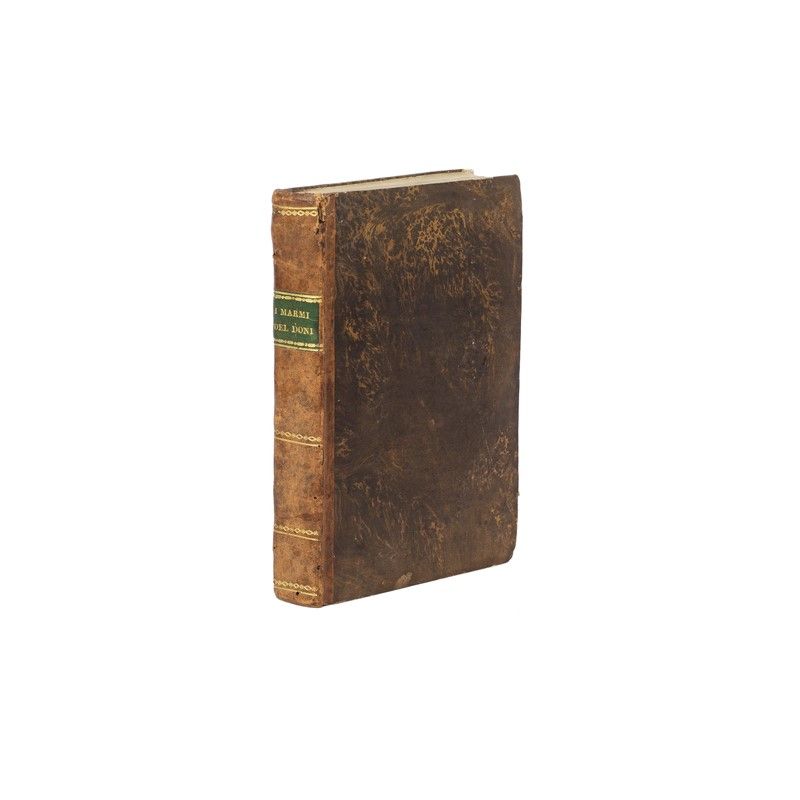 In 4to (200 x 143 mm) in 5 parti. [viii] 66 carte; 40 carte; 81 [i.e. 79] carte (assente K8 bianca); 56 pp.; 64 pp. La terza parte contiene in realtà anche la quarta parte dei Marmi, con proprio frontespizio, ma la numerazione è continua. Marche xilografiche ai frontespizi, vignette xilografiche nel testo, iniziali e fregi xilografici. Testo in corsivo. Mezzo vitellino inizio Ottocento con tassello in marocchino verde al dorso. -- Primo frontespizio restaurato lungo il margine esterno, sottile e leggera macchietta d’inchiostro blu al margine inferiore di alcuni fascicoli, minimi restauri ad H10, forellino con minima perdita a d5, piccolo difetto alla parte superiore della cerniera anteriore, ma nel complesso buona copia.