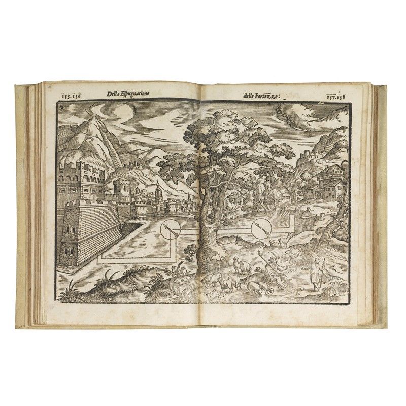 SECOND EDITION, EXPANDED AND RARER on the market than the first published for the first time by Bevilacqua in 1585, of this important Renaissance treatise on military art dedicated to Carlo Emanuele I. Detailed description, condition report and additional images upon request.