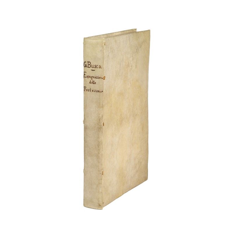 SECONDA EDIZIONE, AMPLIATA E PIÙ RARA sul mercato rispetto alla prima pubblicata per la prima volta da Bevilacqua nel 1585, di questo importante trattato rinascimentale di arte militare dedicato a Carlo Emanuele I. Proprio a fianco di Carlo Emanuele, Busca portò a termine lavori di fortificazione quali la cittadella di Bourg-en-Bresse, il forte di S. Francesco, i forti della Consolata a Demonte e di Santa Maria a Susa, rafforzando lo stato sabaudo e potenziandone l’organizzazione difensiva. Rientrato a Milano nel 1599, venne nominato “architetto regio e ducale dello Stato” e poté sovrintendere a diversi importanti progetti, tra cui la costruzione del Forte di Fuentes. Le undici spettacolari tavole a doppia pagina raffigurano paesaggi rinascimentali con costruzioni o formazioni belliche, con metodi di misurazione, o con poderosi attacchi (in uno si assiste anche alla deflagrazione di un forte con tutti i soldati che saltano per aria).