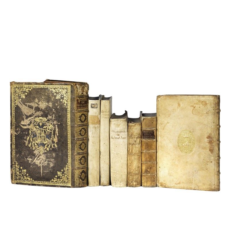 Statuta almae Urbis Romae. Roma, In Aedibus Populi Romani, 1580. In folio in pergamena rigida coeva, armi entro cornice ovale impresse ai piatti, dorso a nervi, tagli dorati (un po’ sciupata), etichetta libreria Bourlot di Torino, grande xilografia al frontespizio, pallidi aloni più forti in alcuni punti, non collazionato. [CON:] Gli Statuti dell’agricoltura. Roma, Tipografia della R.C.A., 1718. In 4to in pergamena rigida coeva con tassello al dorso, assente l’antiporta, galleria di tarlo al margine bianco di un paio di fascicoli, fioriture e altre tracce del tempo, non collazionato. [CON:] ZANCHI, Carlo. Tractatus de praelatione creditorum. Romae, Typis Salomoni, 1766. In folio, bazzana coeva riccamente decorata in oro, armi del cardinale Flavio Chigi (1711-1771) ai piatti, tagli rossi. Ex libris della famiglia romana Elia con motto “In spe offendere nescit”. Ritratto calcografico di Flavio Chigi in antiporta, testo su due colonne, carta bianca e croccante. Non collazionato, sbucciatura con perdita al piatto anteriore, difetti alla cuffia, altre sbucciature e abrasioni. [CON:] MONETA, Giovan Pietro. Tractatus de distributionibus quotidianis. Roma, Andrea Fei, 1621. In 4to in pergamena flessibile coeva con titolo manoscritto al dorso. Frontespizio in rosso e nero con grande ancora aldina, ripetuta in fine. Non collazionato, copia genuina. [CON:] Preclarissimorum prudentum Responsa de privilegio a Nicolao V Pont. Max. Ludovico Sabaudiae duci concesso ad omnes Sabaudiae dignitates Concistoriales. Coloniae Agrippinae, Typis Petri Martelli, 1712. In 4to, piena pergamena coeva. Alone al margine superiore e carte occasionalmente brunite. Serie di scritti giuridici in latino e in italiano relativi all’indulto concesso ai Savoia da Niccolò V, papa dal 1447 al 1455, che permetteva che nei territori sabaudi si potesse accedere alle più elevate cariche ecclesiastiche soltanto se ciò corrispondeva alla volontà e al consenso espresso del duca di Savoia; nei secoli seguenti, l’interpretazione di quest’indulto sarà causa di forti tensioni tra Torino e Roma. Non collazionato. [SI AGGIUNGONO:] Lettere di risposta d’un particolare di Roma ad un amico di Napoli sopra le pendenza di Gravina, s.d., con altra opera datata 1727, in 4to pergamena coeva, e Tractatus singularis de Molendinis, Francofurti, typis Wechelianis, 1625, in 4to in pergamena coeva, molto brunito, non collazionati.