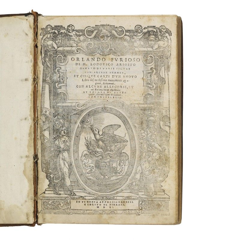 BELLA EDIZIONE GIOLITIANA DELL’ORLANDO, secondo Gamba 53 “la più bella, la più rara e la più stimata di ogni altra”. Pubblicato per la prima volta nel 1516, e poi nel 1521, con correzioni dell’autore, e infine nel 1532, edizione definitiva, l’Orlando ebbe molte ristampe; della presente esiste una tiratura nella quale la vignetta al Canto Ventesimosecondo, alla carta 114, è diritta (come nel nostro caso); altra nella quale è rovesciata.