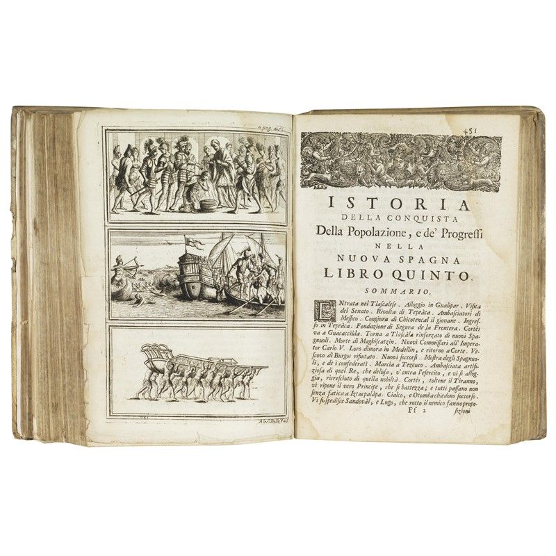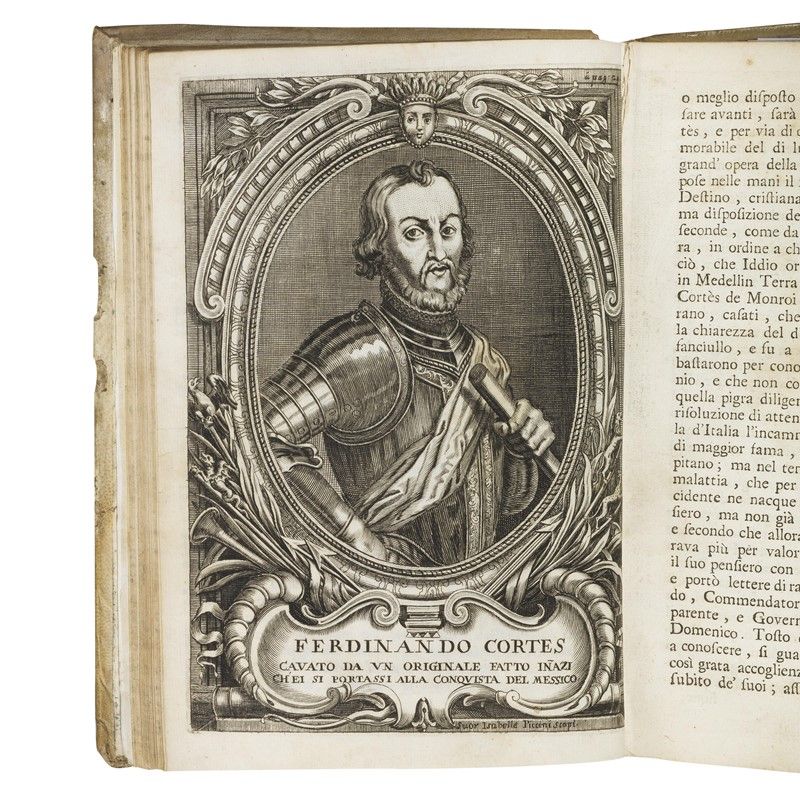 In 4to (210 x 152 mm). [xvi] 624 pp. [8] tavole calcografiche. Iniziali e fregi xilografici. Ritratto dell’Autore in antiporta, di Cortes a p. 29 e di Montezuma a p. 246 incisi da suor Isabella Piccini; le tavole che precedono i 5 capitoli sono incise da Alessandro Dalla Via. Pergamena rigida coeva con tassello al dorso, piuttosto sciupata. -- Antiporta e frontespizio montati su brachetta moderna, pallide gore marginali (leggermente più forti in fine), qualche fascicolo protruso, qualche carta montata su brachetta, qualche macchietta, tavola fronte p. 451 con margini un po’ sciupati. Incisioni fresche.