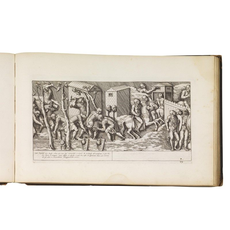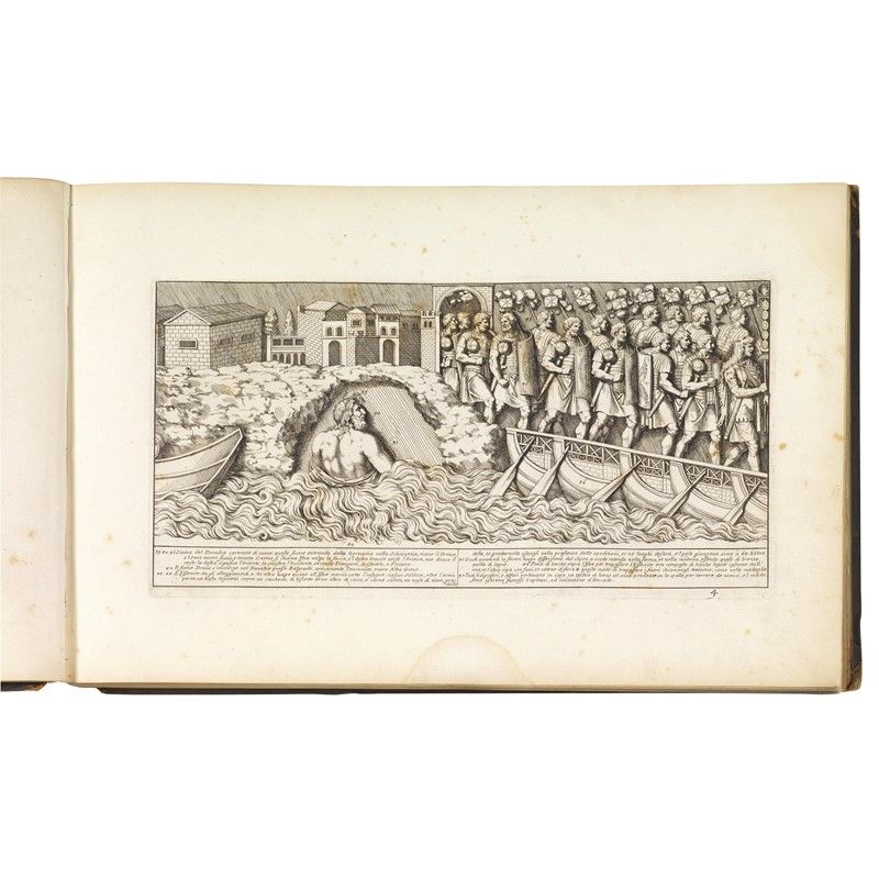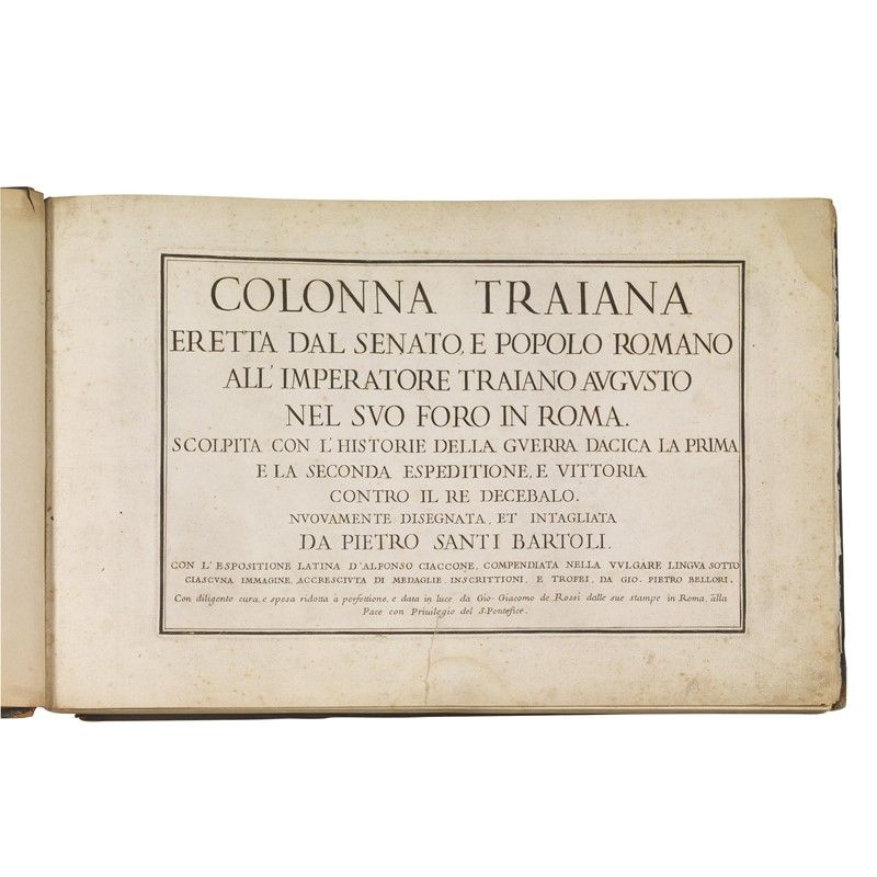 In folio oblungo (302 x 464 mm) in tela moderna con dorso danneggiato. Frontespizio (strappetto restaurato al margine) e dedica incisi, lettera al lettore, [2] tavole, [3] tavole sciolte che formano la Colonna Traiana, [2] tavole con prospetti, 119 tavole (per un totale di 128 tavole incise, inclusi frontespizio e dedica), 14 [2] pp. di testo. Pallide gore e fioriture marginali.