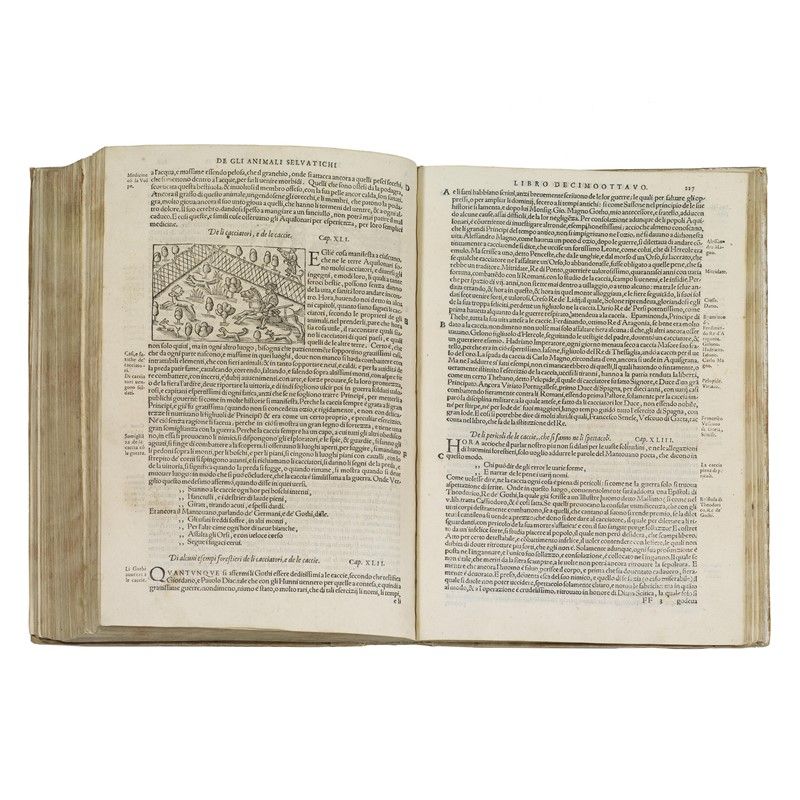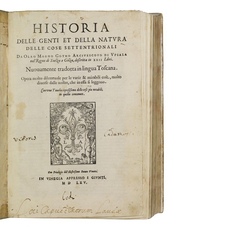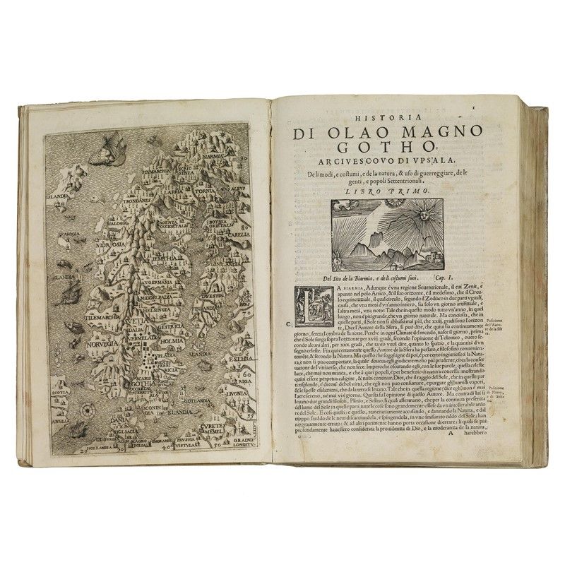 PRIMA EDIZIONE IN ITALIANO ILLUSTRATA. Seconda traduzione italiana dell’opera di Magnus sulla Scandinavia dopo l’edizione veneziana di Francesco Bindoni del 1561 nella versione di Remigio Fiorentino, che però non era illustrata. Lo splendido e ricco repertorio iconografico, costituita da oltre 400 vignette xilografiche, è tratto dalla prima edizione pubblicata in Italia, a Roma, nel 1555, in latino, con la differenza che nella presente edizione la mappa è incisa su rame anziché su legno. Considerata un importantissimo testo di riferimento relativo alla storia naturale, alla cultura, ai costumi e alle pratiche militari scandinave nella seconda metà del Cinquecento, l’Historia delle genti illustra i più vari aspetti della vita di quelle popolazioni: clima (inclusi freddo intenso e suoi effetti, castelli di neve, gestione del ghiaccio), orologi, luoghi soprannaturali, pigmei; nel libro terzo, intitolato “De la superstiziosa cultura de li Demonii, de’ popoli Aquilonari”, sono presentati culti, arti magiche, strumenti magici, maghi marini, ecc.; nel libro quarto, intitolato “De le guerre, e de’ costumi de’ Pagani selvaggi, e de’ vicini”, sono illustrate le caccie dei Lapponi (c. 53v); il quinto libro concerne i “Giganti” e le loro storie, ma anche le donne guerriere; il sesto libro tratta miniere, metalli, monete, orefici, pellicce; il settimo è dedicato agli strumenti di guerra, l’ottavo a governanti, magistrati e esercizio militare, il nono alle guerre campestri, il decimo a quelle navali e al nuoto, l’undicesimo alle guerre su ghiaccio, il dodicesimo all’architettura civile (con paragrafi su alberi e resina), il tredicesimo all’agricoltura (inclusi paragrafi su pane, vino - c. 159 - idromele, ecc.), il quattordicesimo ad abiti, nozze, adulteri ecc., il quindicesimo all’esercizio fisico, alle feste, ai giochi (dadi e scacchi - c. 181), scherma, balli, musica; il sedicesimo parla delle istituzioni ecclesiastiche, di funerali e sepolture, medicina, il diciassettesimo degli animali domestici (cani, cavalli, renne), il diciottesimo degli animali selvatici (alci, lupi, cervi, daini, castori, lepri, linci, lontre, martore, zibellini, ermellini, tassi, orsi, volpi) e della loro caccia (c. 226v), il diciannovesimo degli uccelli (incluso un paragrafo su come curare i falconi e gli altri uccelli da caccia - c. 238 - e uno sulla caccia alle perdici - c. 244v), il ventesimo tratta i pesci e la pesca (inclusi paragrafi sui pesci affumicati e sotto sale), il ventunesimo affronta i pesci mostruosi (orche, balene, pesci alati, polpi ecc.) il ventiduesimo gli insetti (inclusi paragrafi di apicoltura e coltivazione delle perle). La bellissima mappa mostra Svezia, Norvegia, Danimarca e parte di Finlandia.