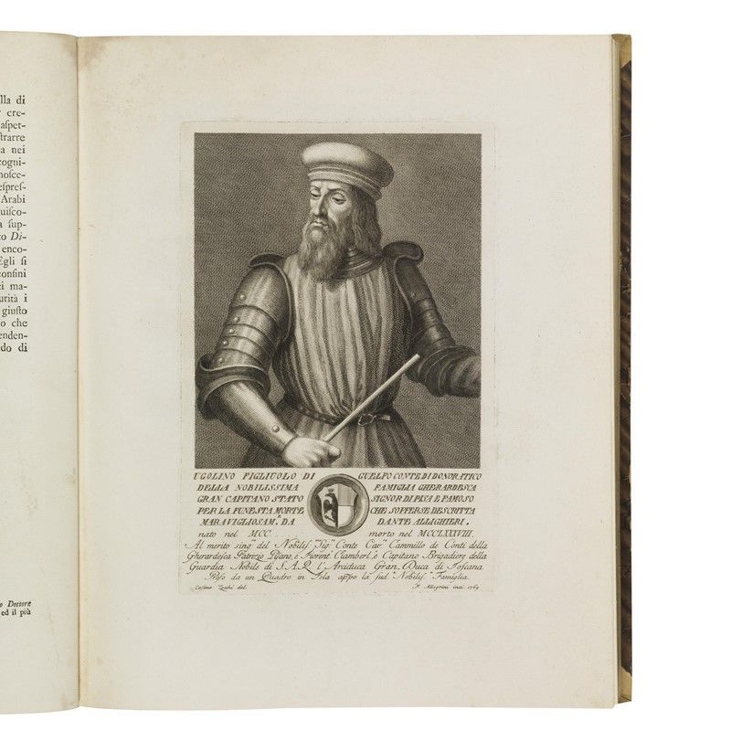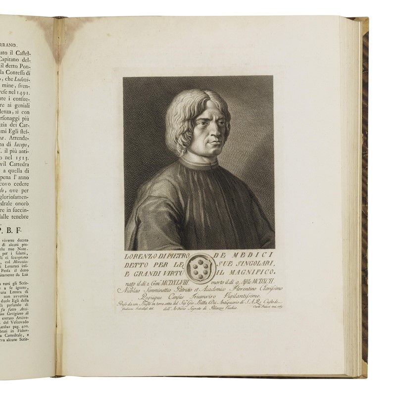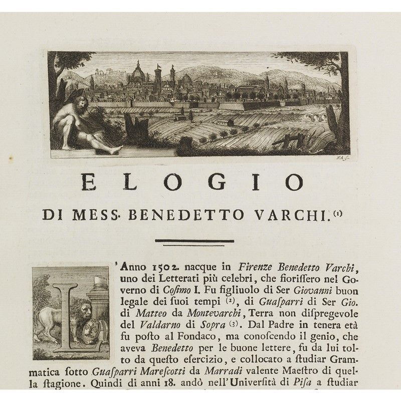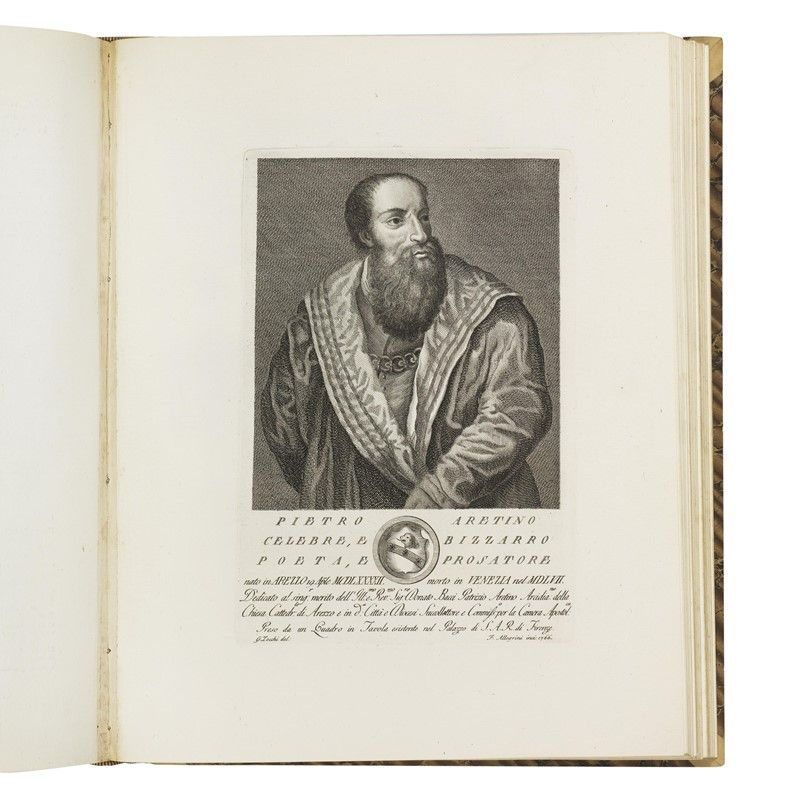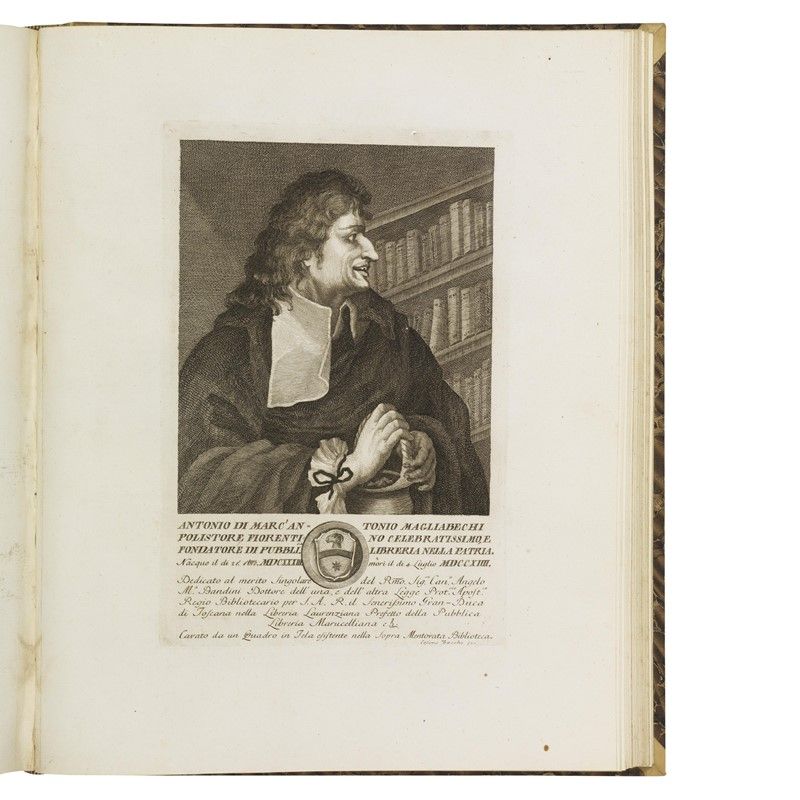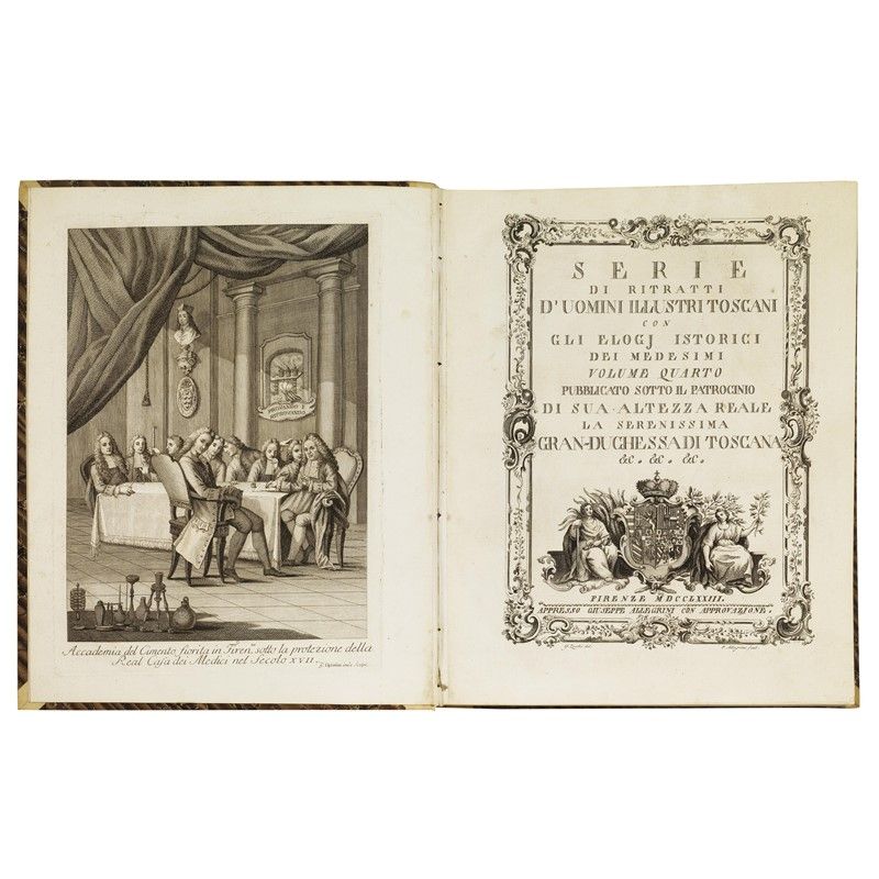 ONE OF THE MOST FAMOUS WORKS PRODUCED BY FLORENTINE PUBLISHING IN THE SECOND HALF OF THE EIGHTEENTH CENTURY, CONTAINING 202 BIOGRAPHS OF ILLUSTRIOUS TOSCANS PORTRAITS BY ZOCCHI and others, decorated with splendid engraved vignettes (headers with views of Florence, figured initials, large illustrated tailpieces), printed on strong, white paper. Lacks one portrait and other defects. Together with a SERIES OF REFINED ALLEGORICAL PLATES IN PURE NEOCLASSICAL STYLE. Detailed description, condition report and additional images upon request.