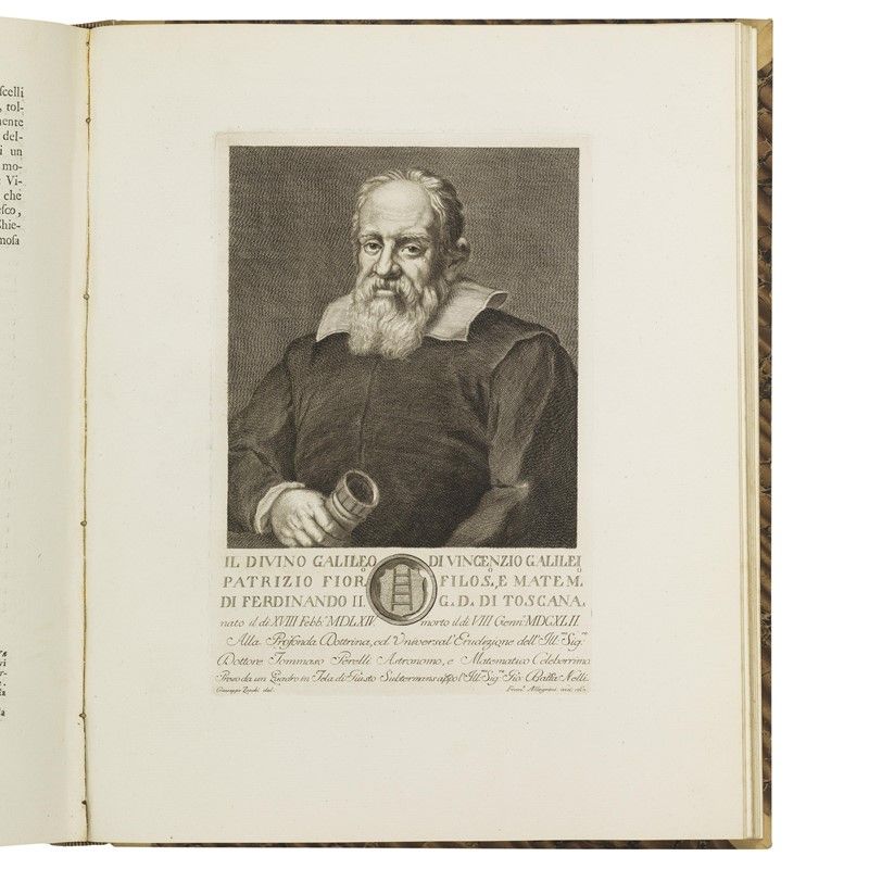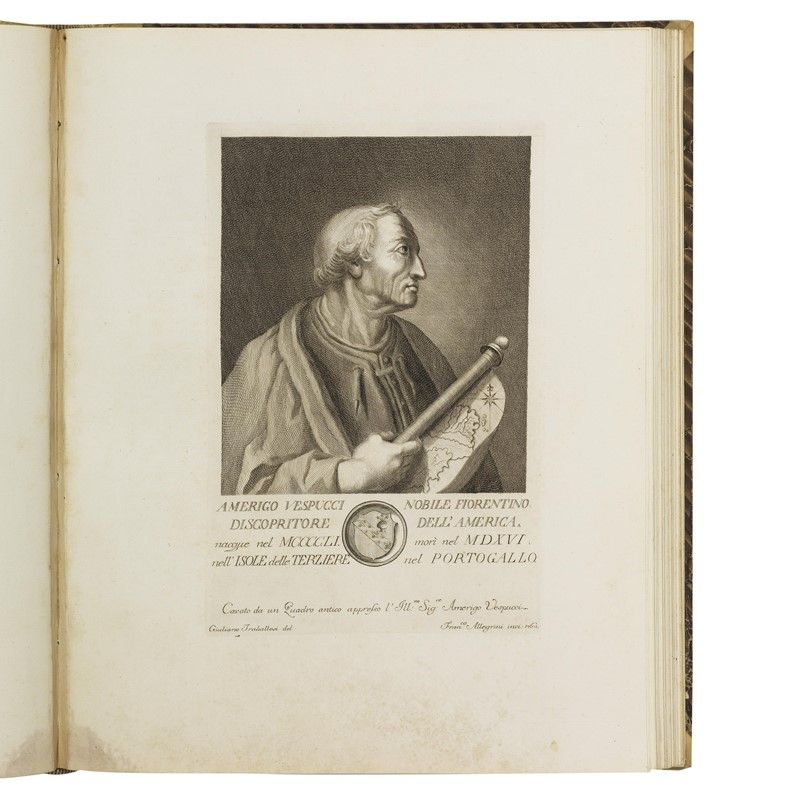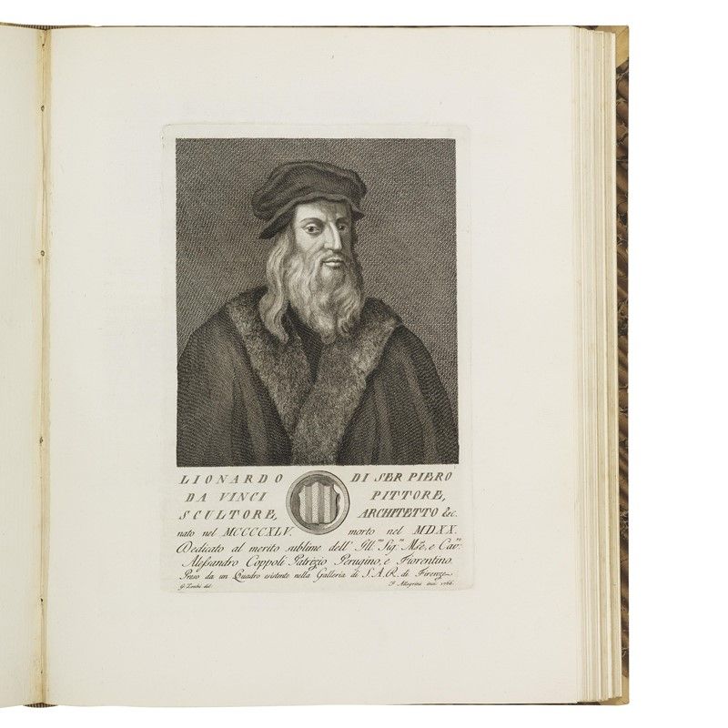 4 volumi in folio (431 x 350 mm). Vol. 1: frontespizio inciso, ritratto di Pietro Leopoldo granduca di Toscana, antiporta incisa, [121] carte di testo e [50] tavole calcografiche. Vol. 2: frontespizio inciso, ritratto di Maria Luisa granduchessa di Toscana, antiporta, [137 (di 138 - assente l’ultima, presumibilmente bianca)] carte di testo e [50] tavole calcografiche. Vol. 3: antiporta, frontespizio, [129] carte di testo e [50] tavole calcografiche. Vol. 4: antiporta, frontespizio, [134] carte di testo e [52] tavole calcografiche. Numerose testatine, iniziali e finalini calcografici. Mezza pergamena leggermente posteriore con doppio tassello in marocchino nero e rosso al dorso, piatti rivestiti in carta marmorizzata. -- Piatto anteriore del terzo volume imbarcato, primo volume con primi e ultimi fascicoli leggermente slegati e con piccolo alone rosaceo al margine interno inferiore (talvolta coperto da pecette cartacee); nel secondo volume il ritratto del Cardinal Bellarmino è rilegato dopo la sua biografia, e l’ultima carta presenta pallide tracce d’umidità al verso; assente il ritratto del dedicatario Leopoldo II nel terzo volume, che presenta un piccolo alone rosaceo al margine interno superiore; gora sottile al margine interno delle ultime dieci carte del quarto volume, che presenta uno stappetto all’ultima carta, qualche abrasione e altre tracce del tempo alle legature, ma nel complesso copia genuina con impressioni fresche.