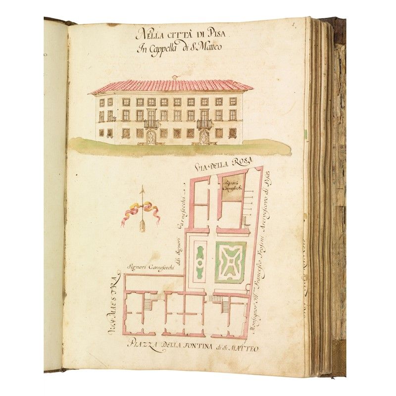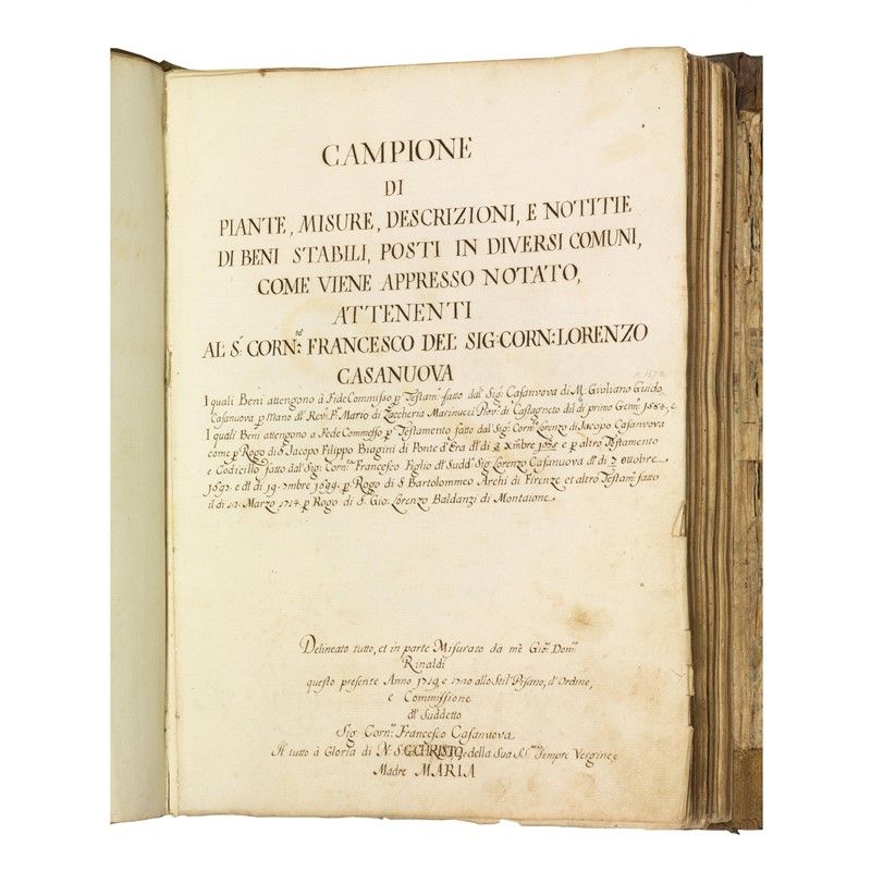 MONUMENTALE CABREO SETTECENTESCO relativo a zone oggi in provincia di Pisa e Livorno, illustrante i vasti possedimenti rurali, comprendenti poderi, campi e boschi (inclusi numerosi vigneti e oliveti), che appartenevano nel 1720 a Francesco Casanuova, committente dell’opera. I Casanuova sono attestati a Castagneto Carducci dalla metà del Cinquecento. L’autore Giovanni (o Giovan) Domenico Rinaldi è registrato al servizio dello Scrittoio delle Regie Possessioni, organo amministratore del patrimonio del Granducato di Toscana, negli anni venti del Settecento (cfr. digitaldisci.it). Il volume si apre con il frontespizio seguito dal grande stemma del Casanuova alla pagina successiva, e da nove pagine di “Indice Universale delle case, e pezzi di terra posti per ordine nei loro comuni” ove sono elencati: una casa di abitazione a Pisa, e poi case, poderi, campi, vigne, boschi, uccelliere e colombiere, fonti e corsi d’acqua, nei comuni di: Peccioli, Montefoscoli, Terricciola, Alica, Ceppato, Pastina e Santa Luce, Castagneto, Campiglia, Sassetta, Bibbona, Guardistallo, e Casale. Ogni possedimento è successivamente descritto con la località, la consistenza e la provenienza, e illustrato con disegni che raffigurano vedute e piante delle case con le vie confinanti, e mappe dettagliate dei vari territori con la precisa suddivisione dei terreni (uliveti, vigneti, alberi da frutto, boschi di querce, castagni e altri alberi, campi e prati, ecc.), i loro confini e le loro misure (alla prima carta vi è una “scala di canne di braccia cinque l’una”). La rosa dei venti è presente su molte delle 141 pagine illustrate, che talora contengono due diversi disegni. Le fonti sono vari atti testamentari citati al frontespizio e nei singoli testi di accompagnamento.