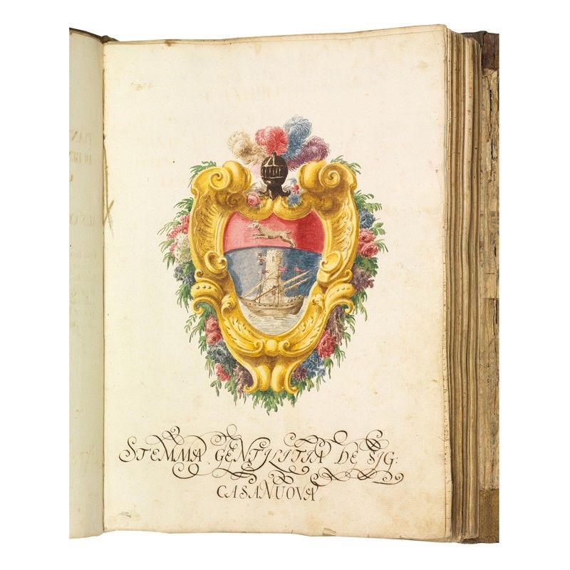 Manoscritto cartaceo in folio (441 x 310 mm) di [12] 291 carte più altre [7] carte bianche numerate 293-302 (per un totale di 620 pagine, scritte 294), contenente un grande stemma policromo dei Casanuova con veltro, torre e vascello, e 141 pagine con disegni originali a colori. La carta è forte e per lo più bianca, la grafia leggibile. Legatura a busta originale dell’epoca in pelle scura con chiusura in corda e fermaglio di metallo, interni in carta marmorizzata. Preservato in ulteriore custodia antica rivestita in tela grezza con lacci. Tracce d’uso e del tempo, ma nel complesso copia genuina molto ben conservata.