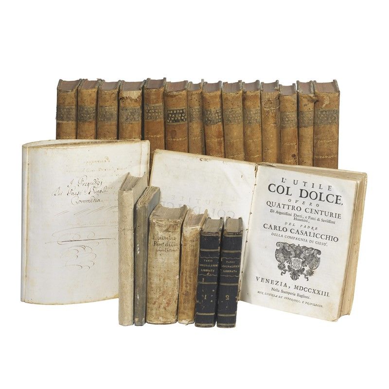 Lebeau - Ameilhon. Storia del Basso Impero da Costantino il Grande fino alla presa di Costantinopoli. Venezia, Pietro Savioni, 1767-1787. 29 volumi in 8vo piccolo, legatura coeva in mezza pelle molto sciupata, difetti vari, non collazionato, assenti vari volumi. [CON:] TASSO, Torquato. La Gerusalemme Liberata. Londra (Pescia), si vende in Livorno presso Gio. Tom. Masi, 1778. 2 volumi in mezza pelle coeva (abrasioni e sbucciature), antiporta, frontespizi e ritratto del Tasso incisi su rame, tavole in rame, timbretto ed etichetta ai frontespizi, fioriture e altri difetti, non collazionato. [CON:] FANTONI, Giovanni. Poesie e prose di Labindo. 1885. In 8vo in brossura muta coeva, in barbe, non collazionato. [CON:] CASALICCHIO, Carlo. L’utile col dolce, overo Quattro centurie di argutissimi detti, e fatti di saviissimi huomini. Venezia, Stamperia Baglioni, 1723. In 4to in pergamena rigida coeva, testo su due colonne, ultima carta strappata con perdita, non collazionato. [CON:] CICERONE. Epistolarum ad familiares libri XVI. Roma, Mainardi, 1736. In 16mo in pergamena coeva, sciupato, non collazionato. [CON:] CICERONE. Gli uffizzi e gli opuscoli sulla vecchiezza, e sull’amicizia […] in Toscan linguaggio recati. Venezia, Tommaso Bettinelli, 1791. In 8vo in carta rustica coeva e barbe, fioriture occasionali [CON:] SALVI, Antonio. Andromaca, dramma per musica da rappresentarsi nel nobil teatro a Torre Argentina il carnevale dell’anno 1753. In Roma, si vendono da Fausto Amidei libraro, [1752 o 1753]. Tarlato e sciolto, non collazionato. [CON:] I pregiudizi dei paesi piccoli. Commedia. Manoscritto settecentesco in 4to in cartonato coevo rivestito in carta marmorizzata, frontespizio e 81 pagine scritte, buone condizioni generali.