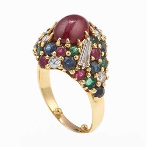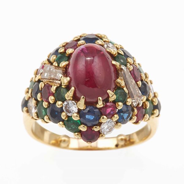 Anello con rubino taglio cabochon e diamanti, zaffiri, smeraldi a contorno