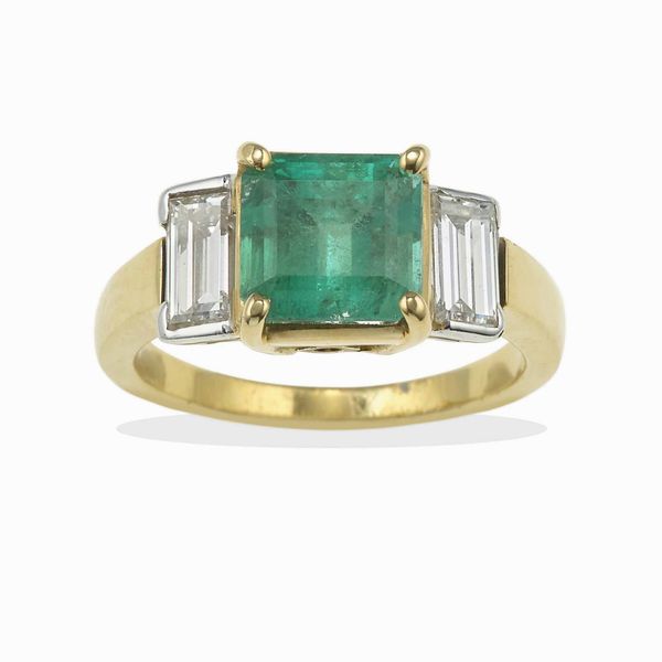 Anello con smeraldo Colombia di ct 2.00 circa e due diamanti taglio baguette per [..]