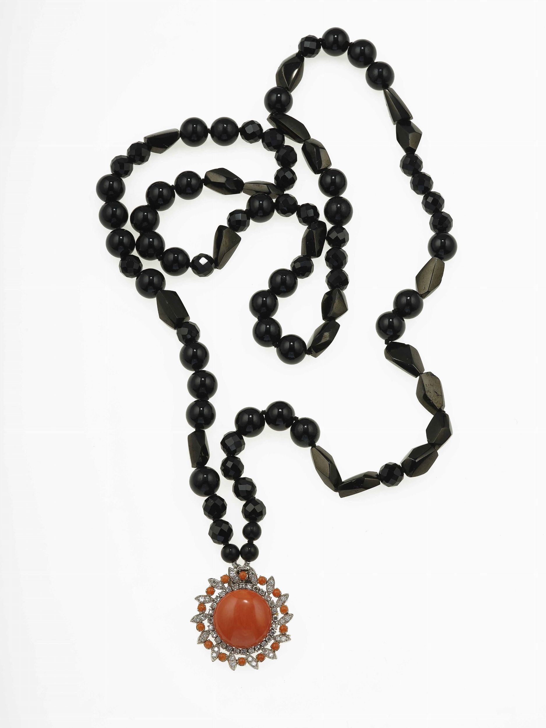 Collana con corallo nero e pendente con corallo rosso e diamanti
