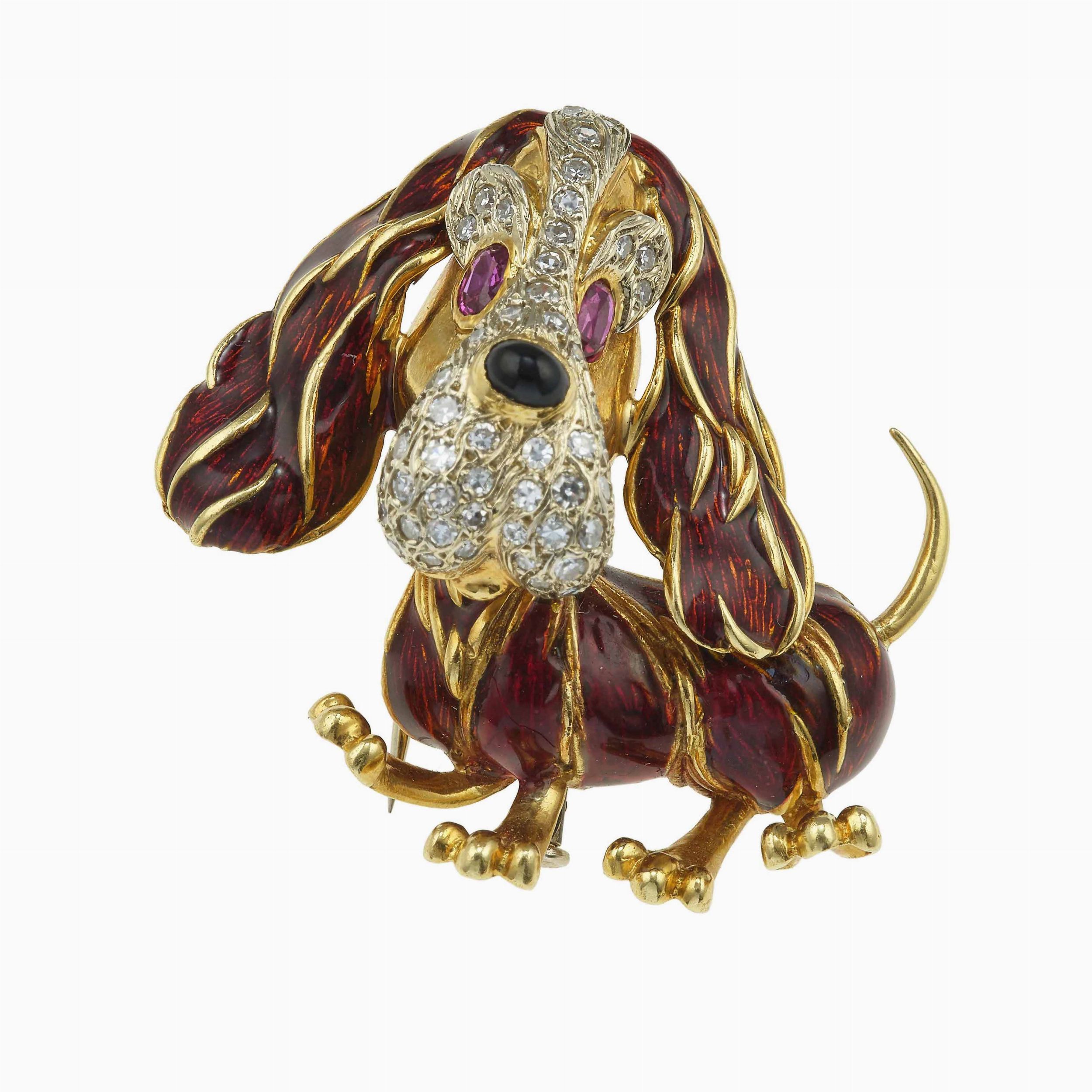 Frascarolo. Spilla cane con smalti, diamanti e rubini