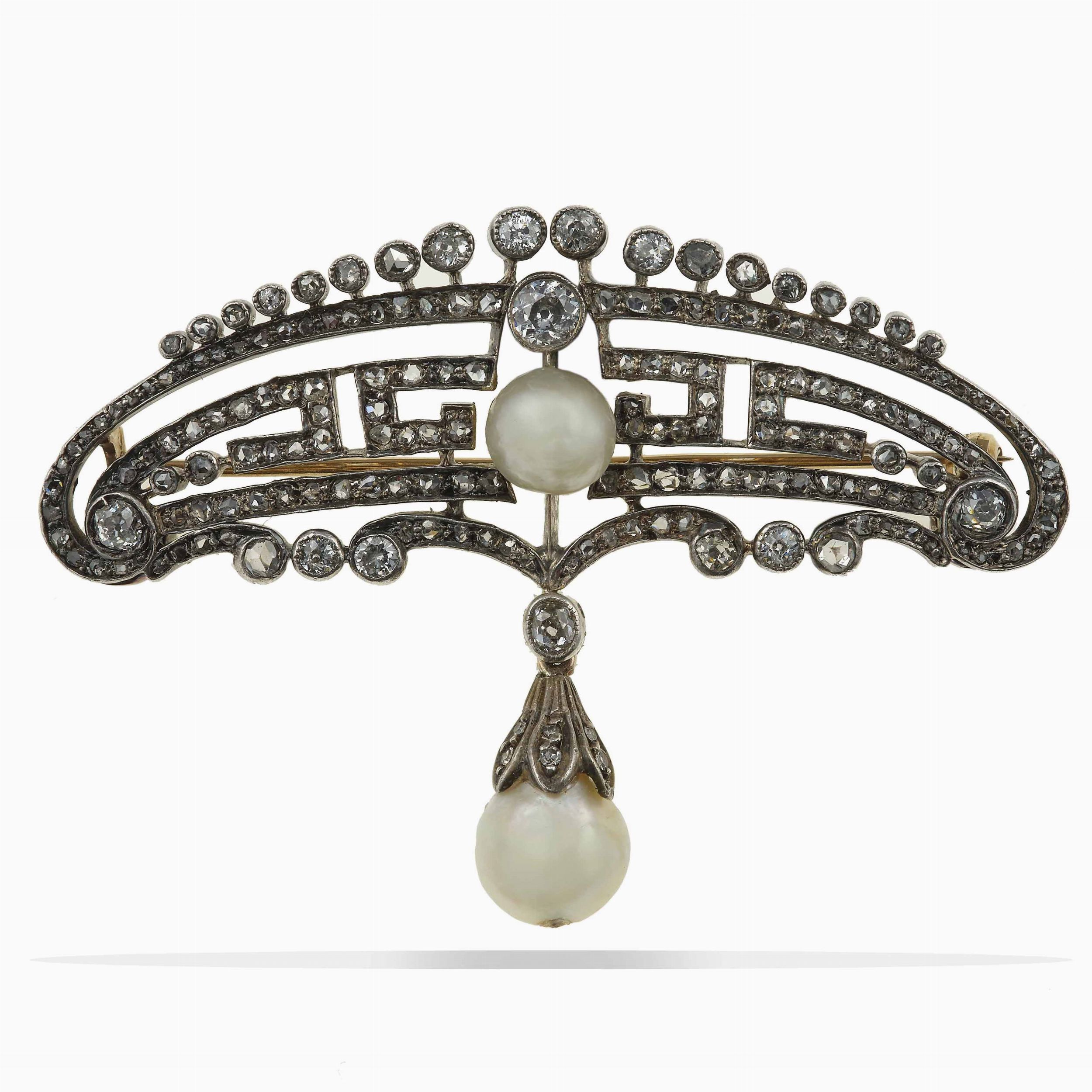 Spilla con diamanti di vecchio taglio e perle naturali
