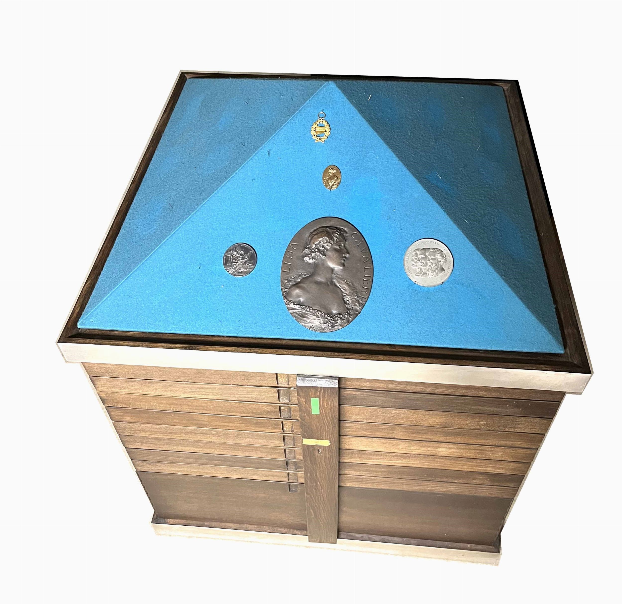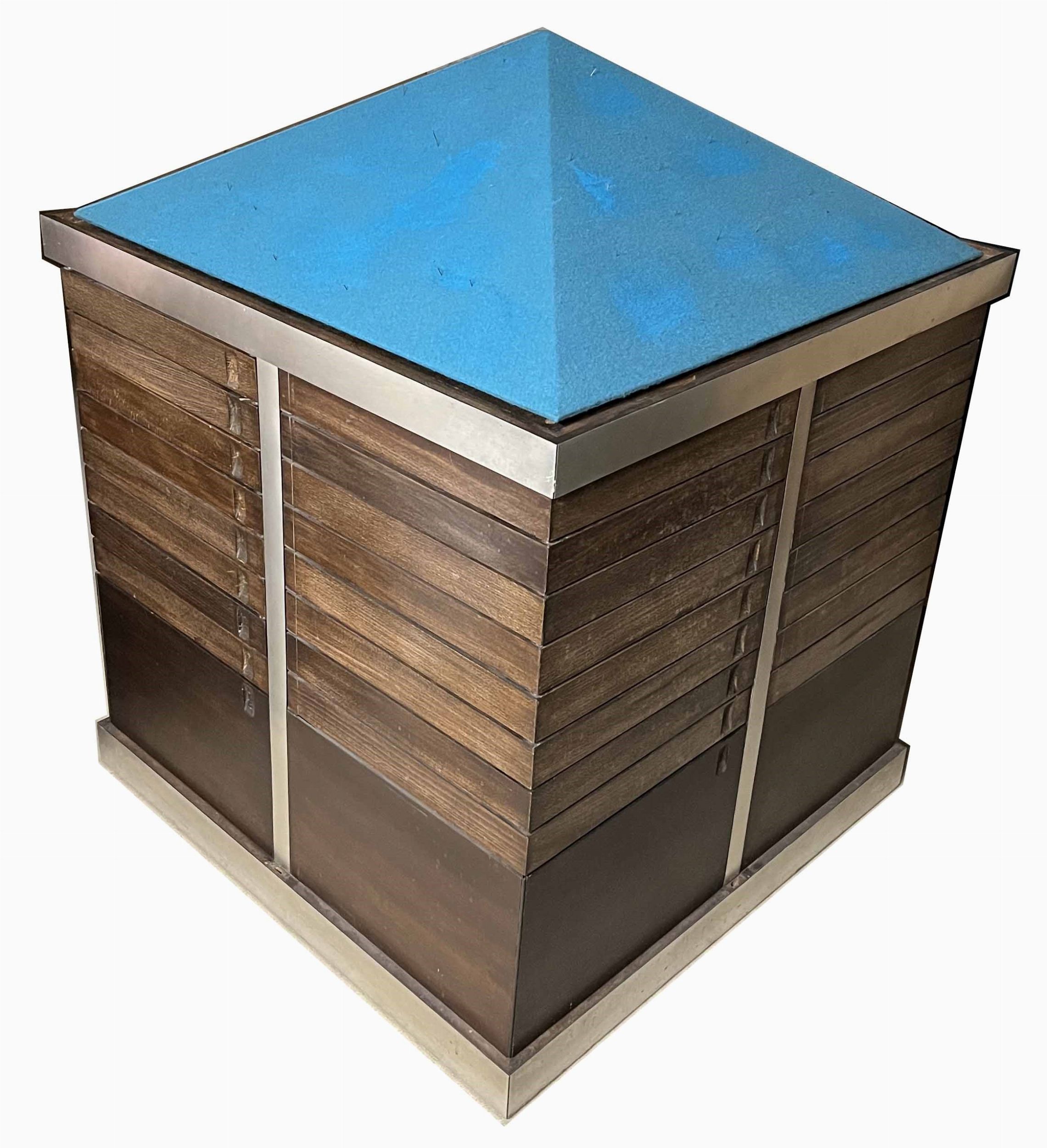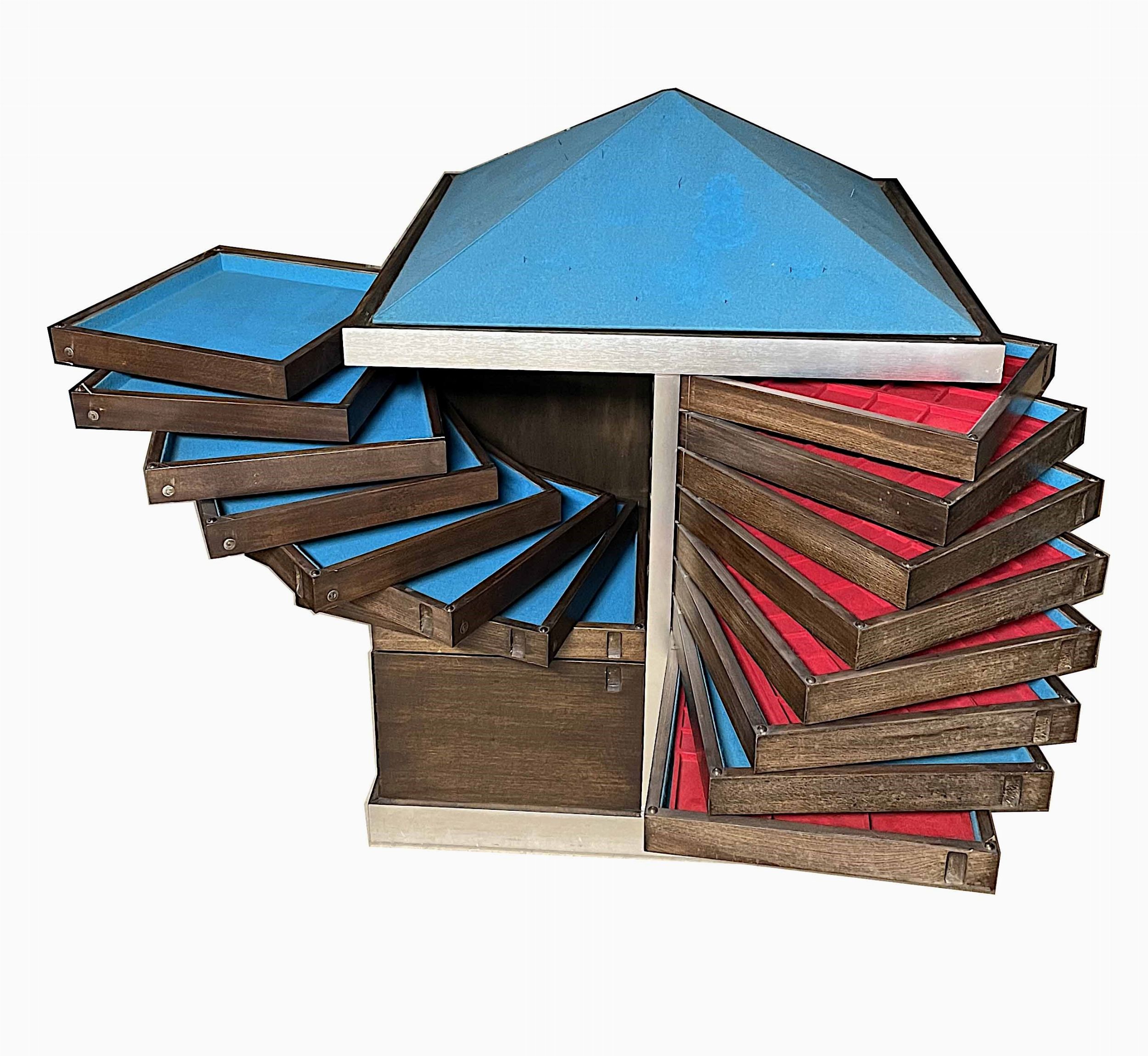 ELEGANTE MOBILE-MONETIERE IN LEGNO DI NOCE CON RIFINITURE IN ACCIAIO SATINATO DELLA [..]