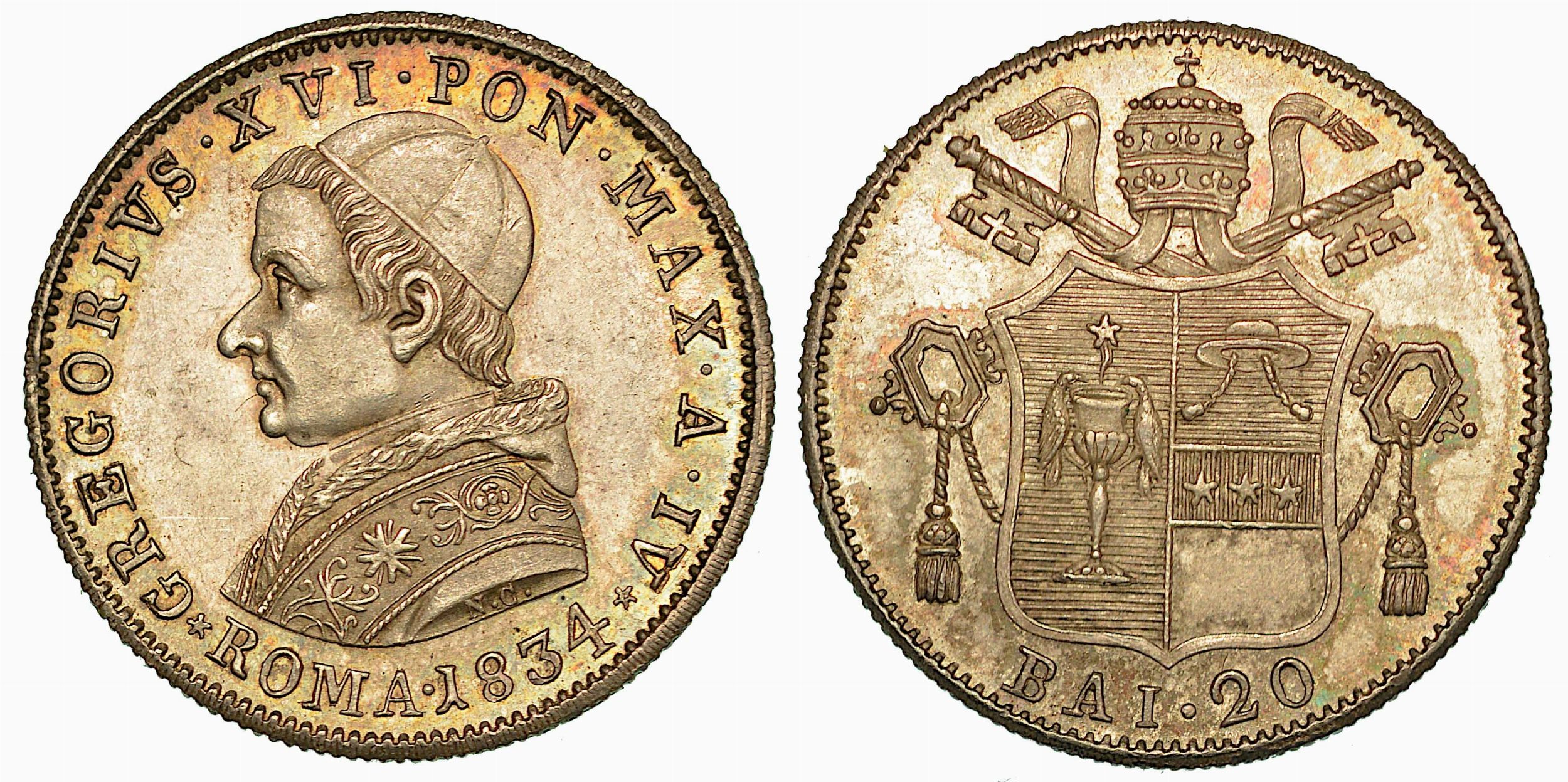 GREGORIO XVI (BARTOLOMEO ALBERTO CAPPELLARI), 1831-1846. 20 Baiocchi 1834/A. IV. [..]