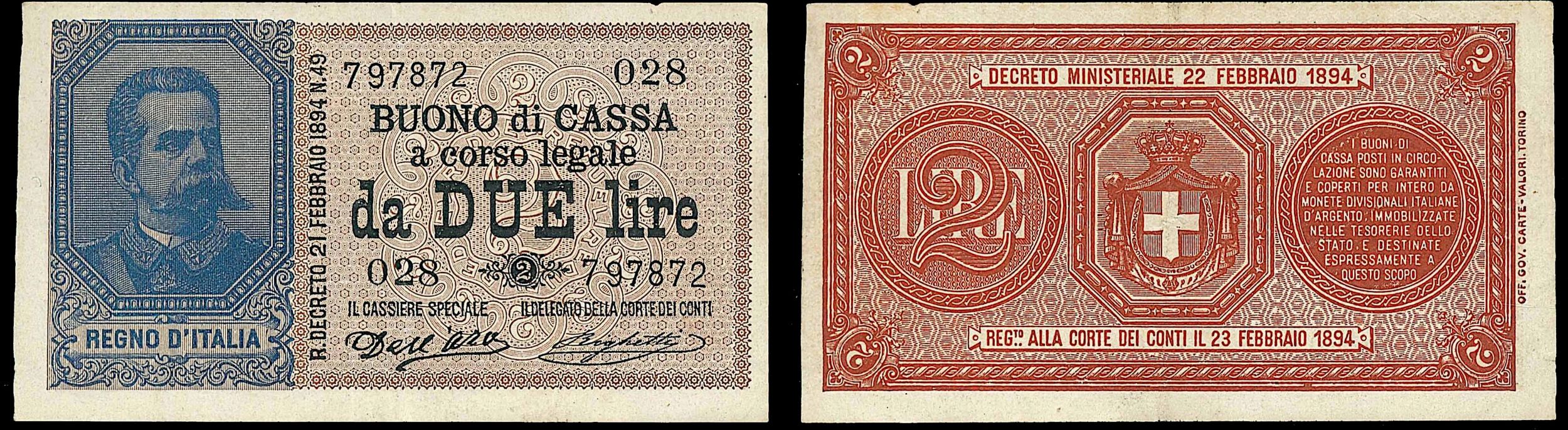 REGNO D'ITALIA. UMBERTO I DI SAVOIA, 1878-1900. Buono di Cassa da 2 Lire 22/02/1 [..]