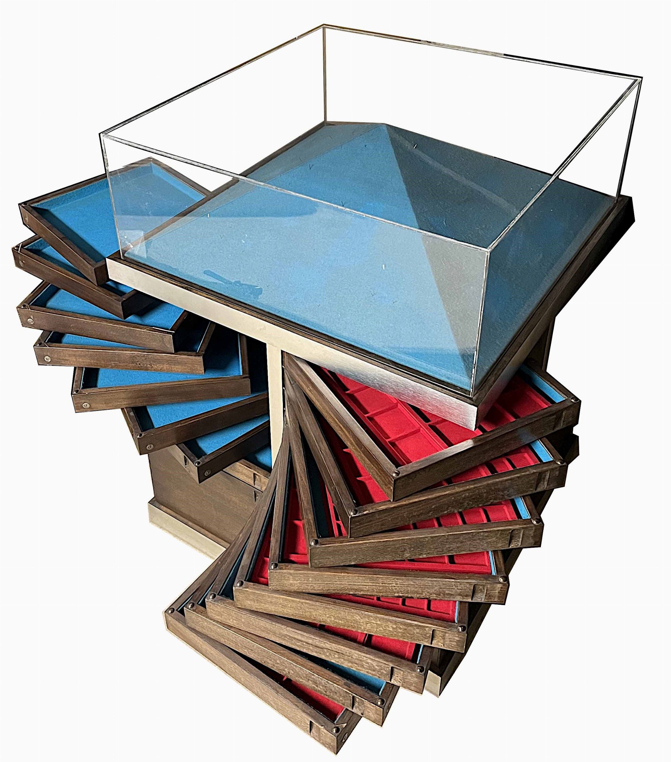 ELEGANTE MOBILE-MONETIERE IN LEGNO DI NOCE CON RIFINITURE IN ACCIAIO SATINATO DELLA [..]
