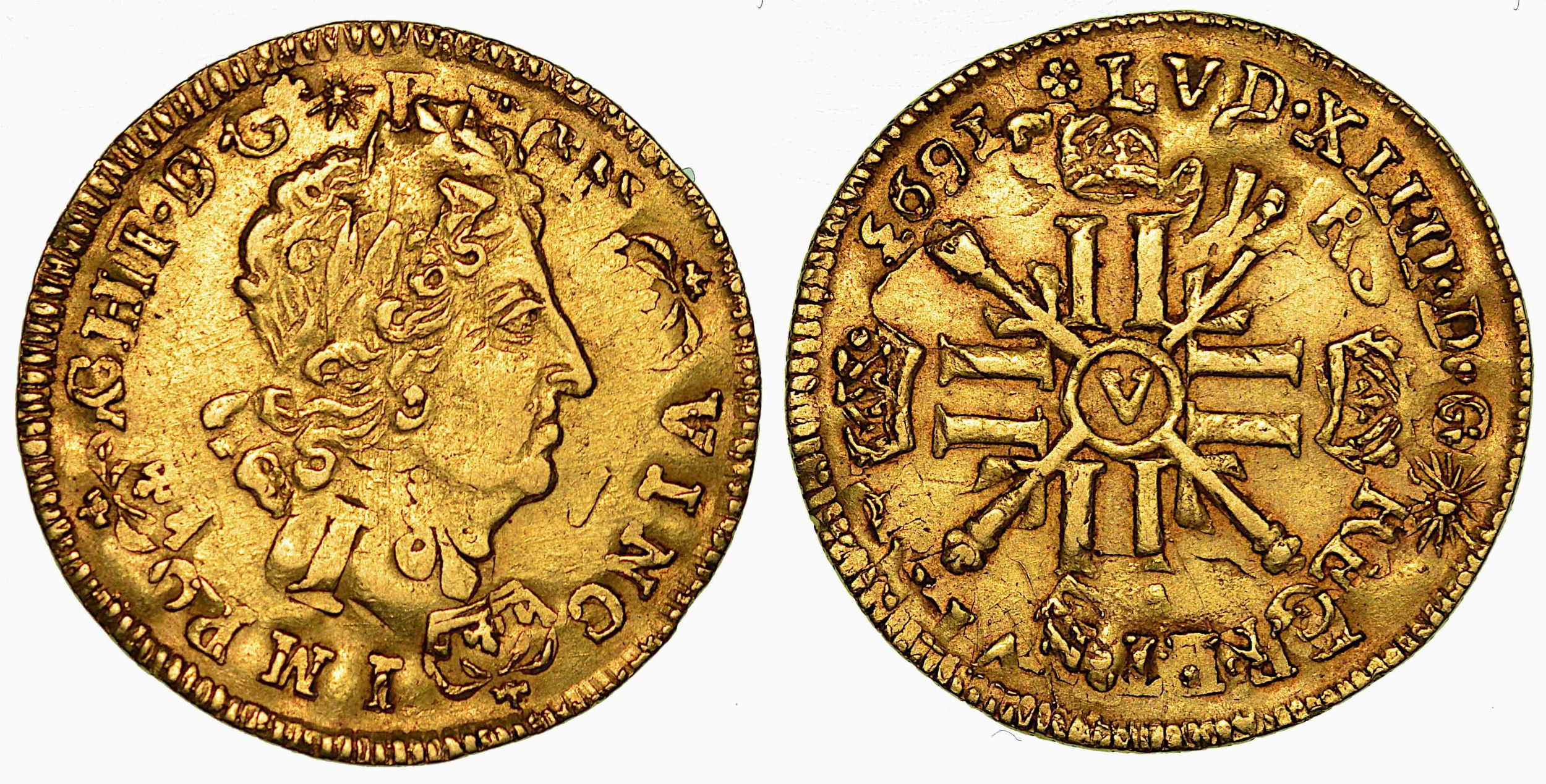 FRANCIA. LOUIS XIV, 1643-1715. 1/2 Louis d'or 1693 (tipo con otto L). Troyes.