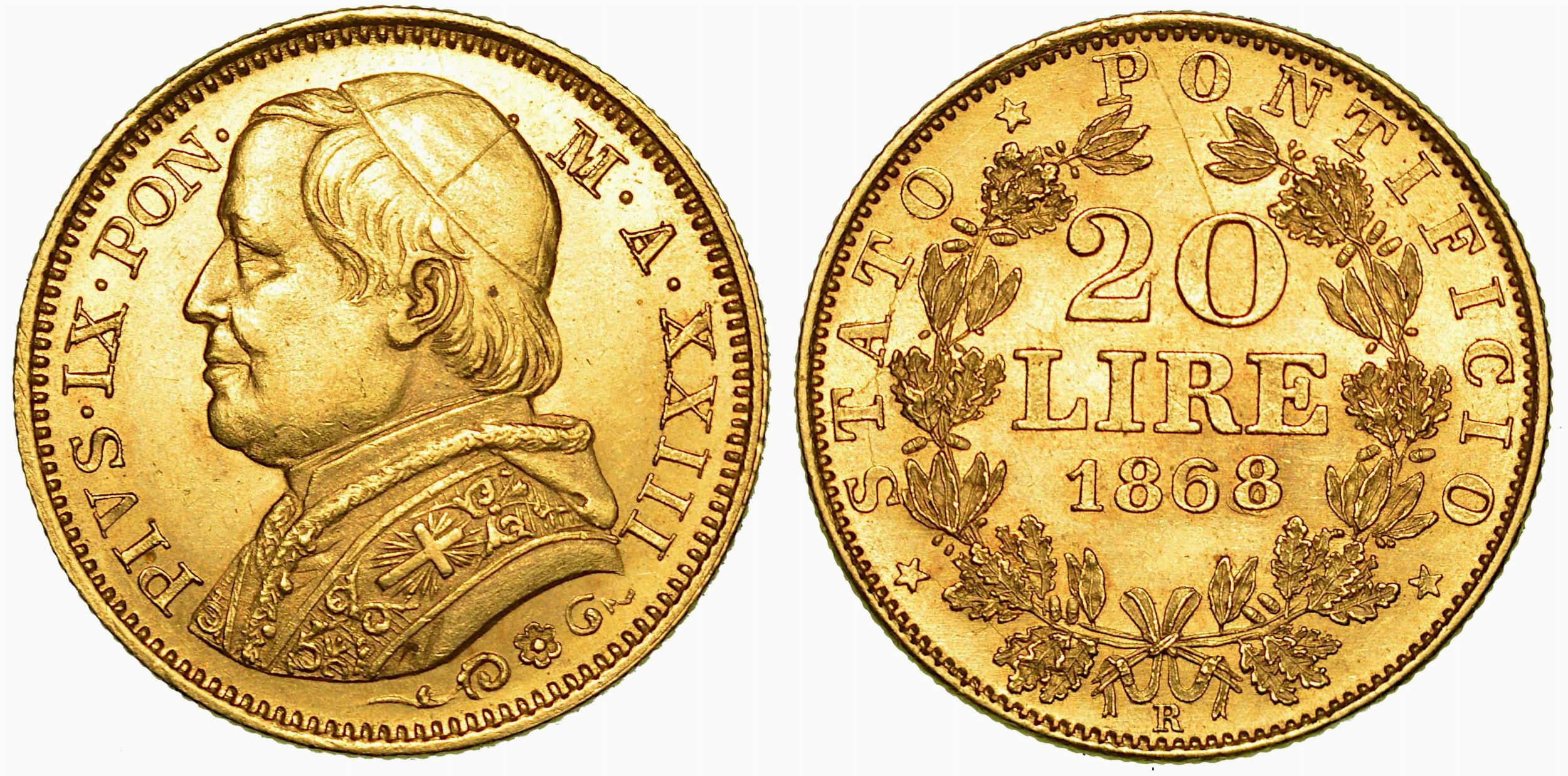 PIO IX (GIOVANNI MARIA MASTAI FERRETTI), 1846-1878. 20 Lire 1868/A. XXIII.