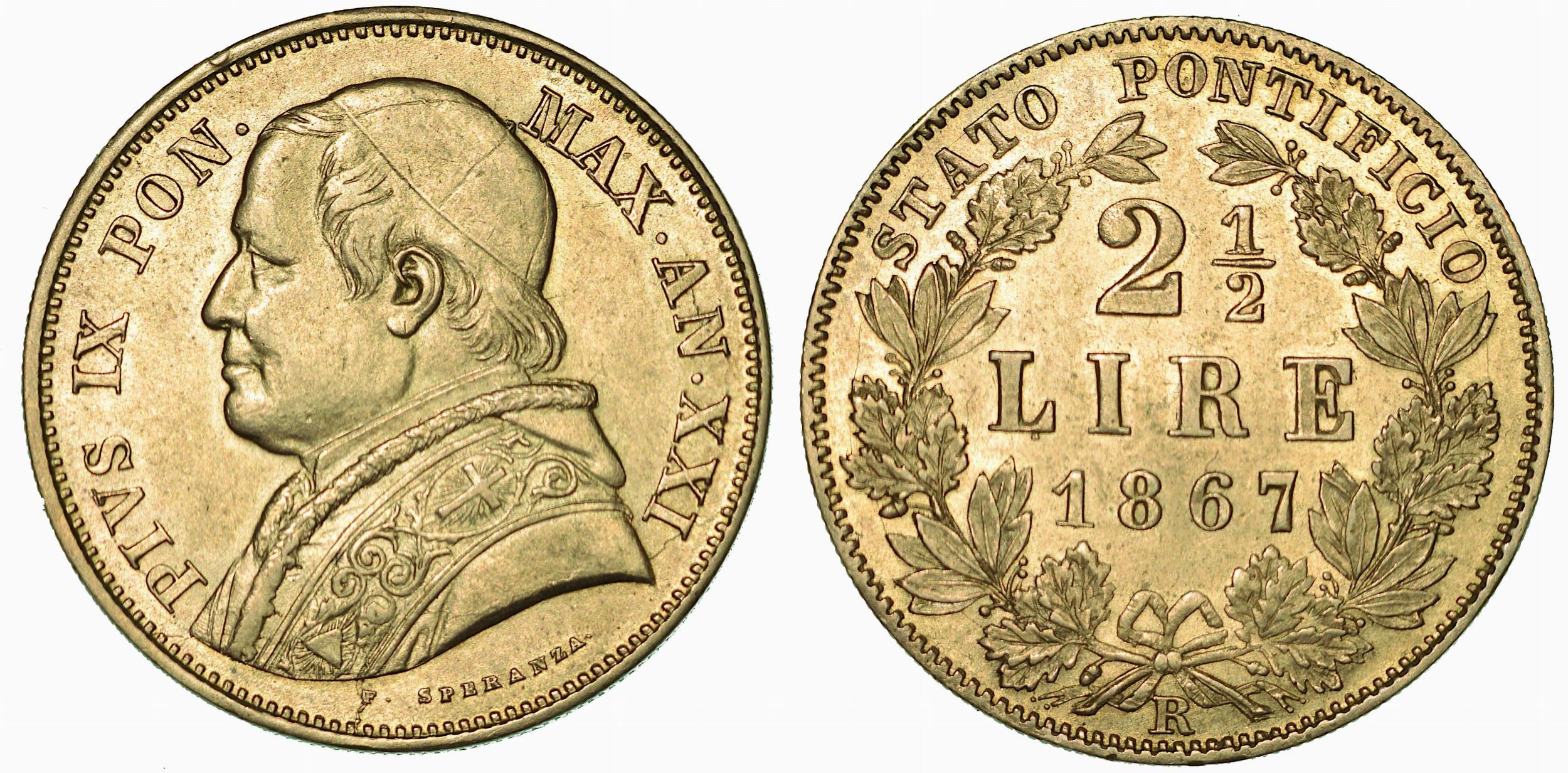 PIO IX (GIOVANNI MARIA MASTAI FERRETTI), 1846-1878. 2 1/2 Lire 1867/A. XXI.