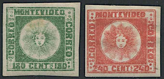 1858, Uruguay, 180 cent. green and 240 cent. red