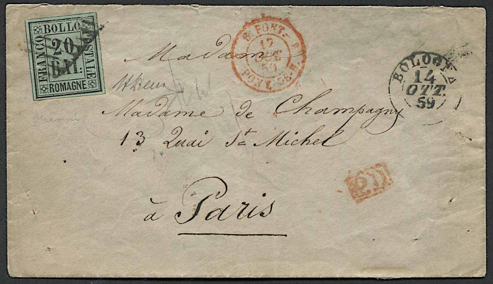 affrancata con venti baj di Romagne (S. 9) in tariffa per corrispondenza diretta in Francia. Bollo di transito in rosso “B. PONT./PONT DE B./17 OCT. 59” e al verso bollo di arrivo a Parigi del 17 ottobre. Bellissima, rara, esemplare con ottimi margini. A. Diena. Per la Francia restarono in vita gli accordi postali preesistenti tra lo Stato Pontificio e il Granducato di Toscana. Queste corrispondenze continuarono quindi ad essere trasmesse per la via della Toscana con le più onerose tariffe dell’Amministrazione Pontificia. Il bollo di scambio francese riporta ancora la dicitura “B. PONT.” (Bureau Pontifice).
