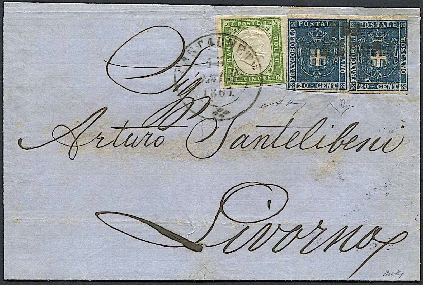 Affrancata per 45 centesimi con 5 centesimi di Sardegna (S. 13Cc) e coppia del 20 centesimi azzurro di G.P. di Toscana (S. 20). Annullati con d.c. di Castagneto e la coppia con bollo SD su due righe “Per Consegna” (S.P. R3). Rara affrancatura mista, unica col bollo “Per Consegna” di Castagneto. Certificato E. Diena e Bolaffi.