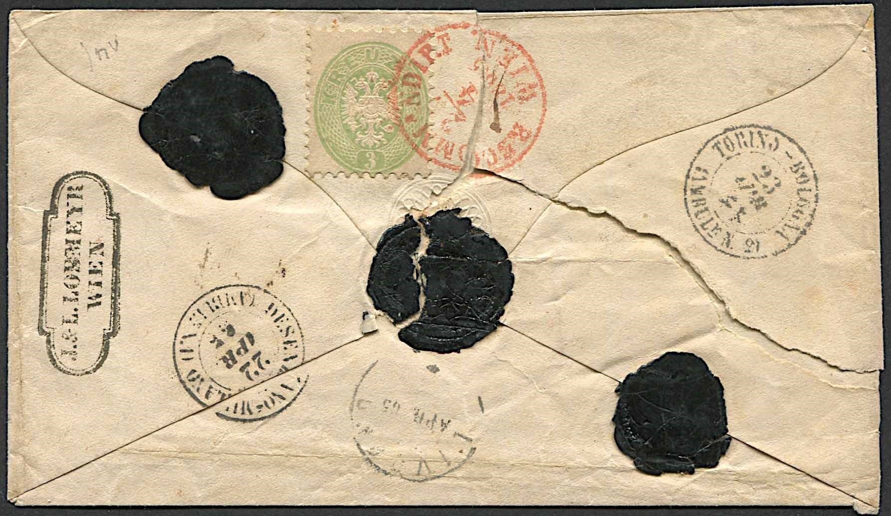 1865, Austria, raccomandata da Vienna per Livorno del 20 aprile 1865