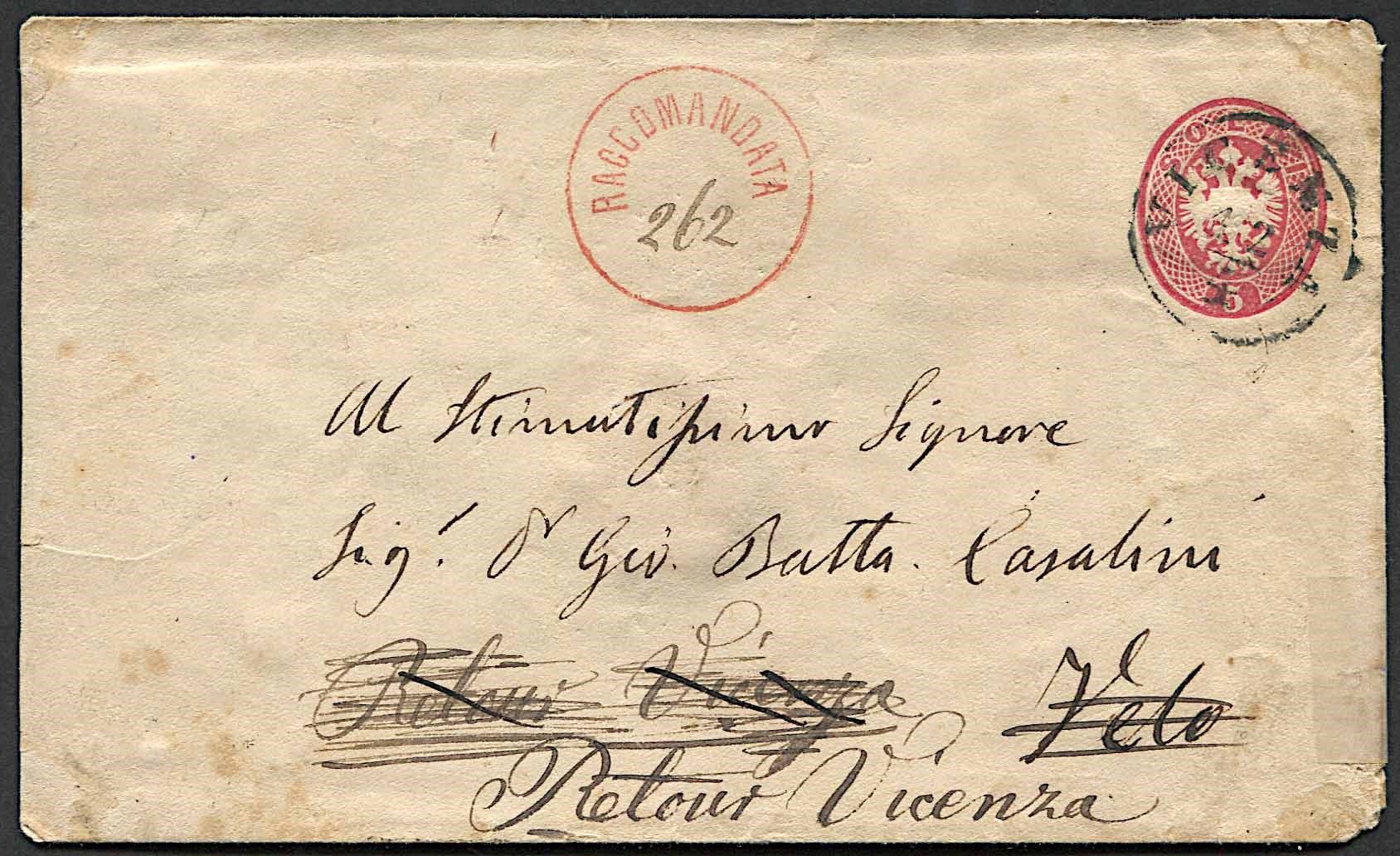 Intero postale raccomandato da 5 soldi da Vicenza per Velo d’Astico del 12 aprile [..]