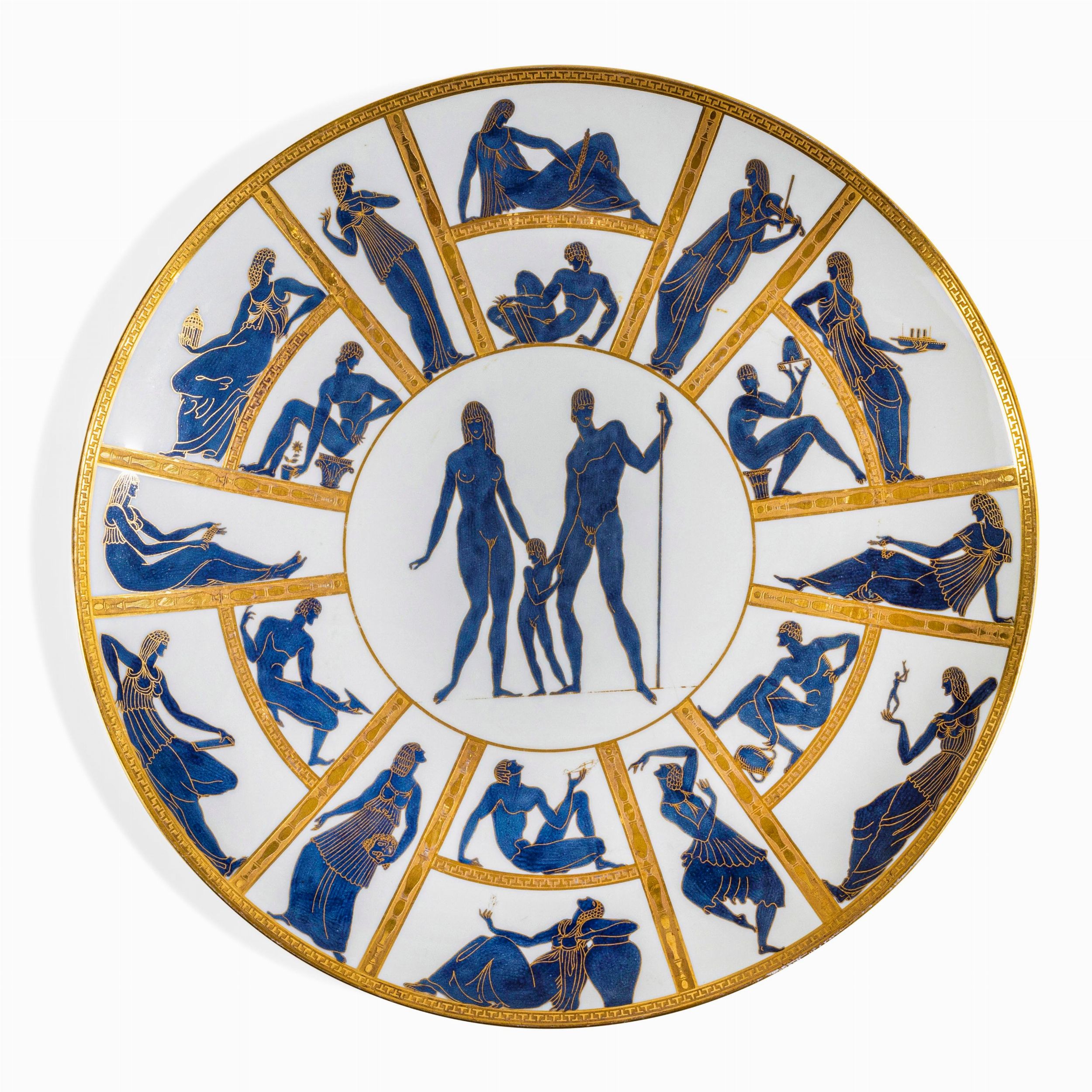 Largh. 33 - Prof. 3 - Alt. 33 Cm Piatto da parata in porcellana bianca, oro e blu, con incisioni in oro sul bordo e sulla falda. Modello di partenza per la successiva serie de Le Attività Gentili. Presentato alla prima Biennale di Monza del 1923. Marchio della manifattura Richard Ginori 29=1 in verde, Richard Ginori Pittoria di Doccia in oro e Le attività gentili in azzurro. Marchiato con la firma Gio Ponti in oro. Prod. Richard-Ginori, Pittoria di Doccia, Italia, 1925
