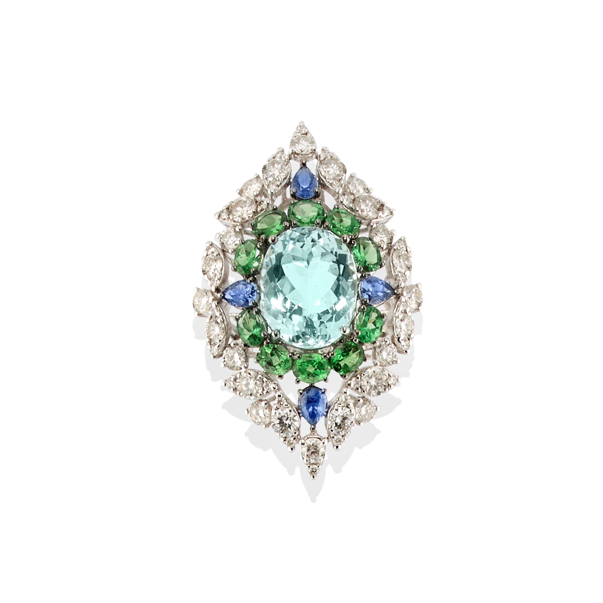 a losanga, al centro acquamarina taglio ovale di ct 5,00 circa, tzavoriti taglio ovale per totale ct 1,80 circa, zaffiri taglio goccia per totale ct 0,80 circa e diamanti taglio brillante per totale ct 2,30 circa.