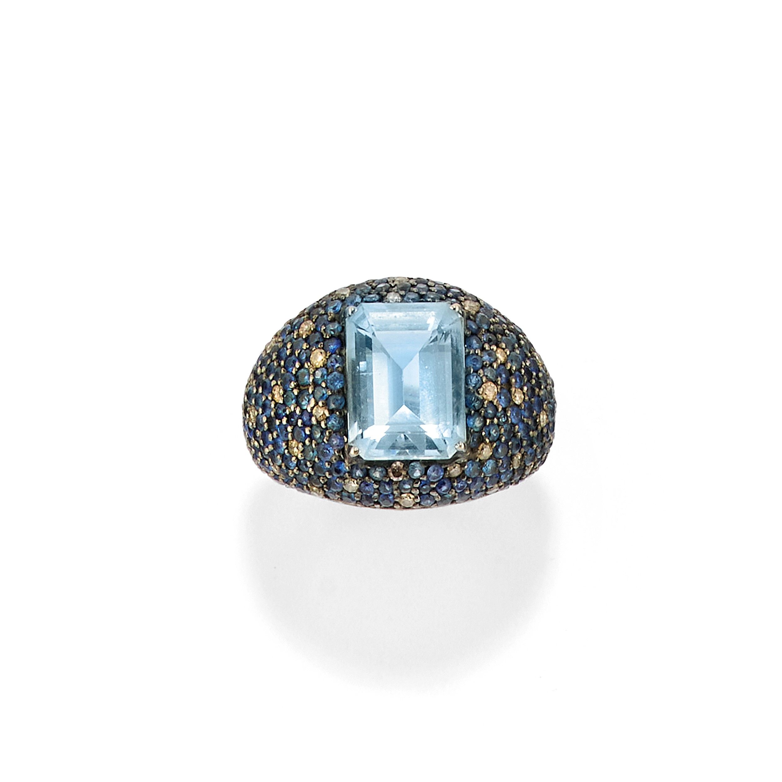 di forma bombata, acquamarina taglio smeraldo al centro, zaffiri e diamanti taglio rotondo a decoro.