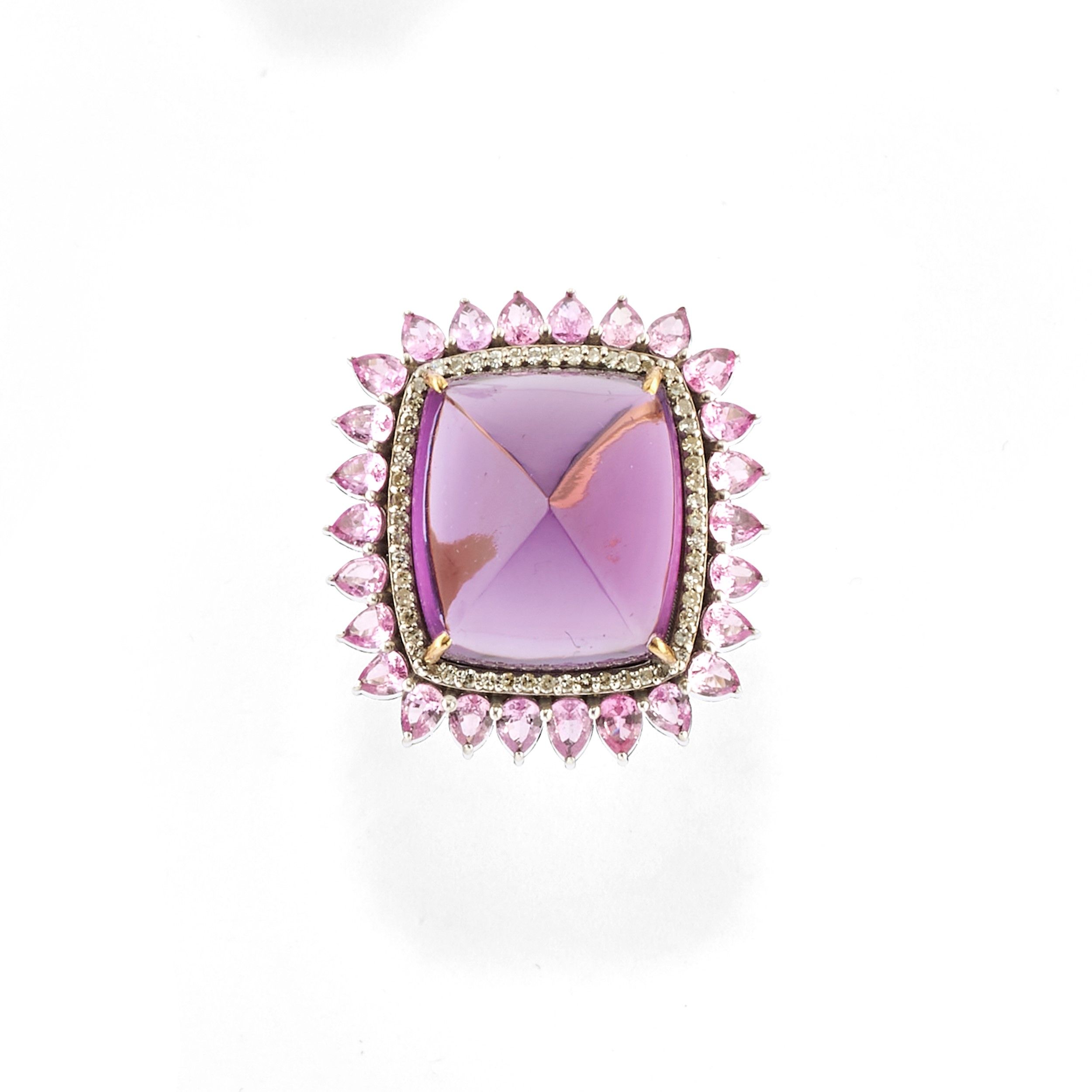 ametista taglio piramide di ct 25,00 circa contorno in diamanti taglio huit-huit per totale ct 0,50 circa, cornice esterna in zaffiri rosa taglio goccia per totale ct 3,00 circa.