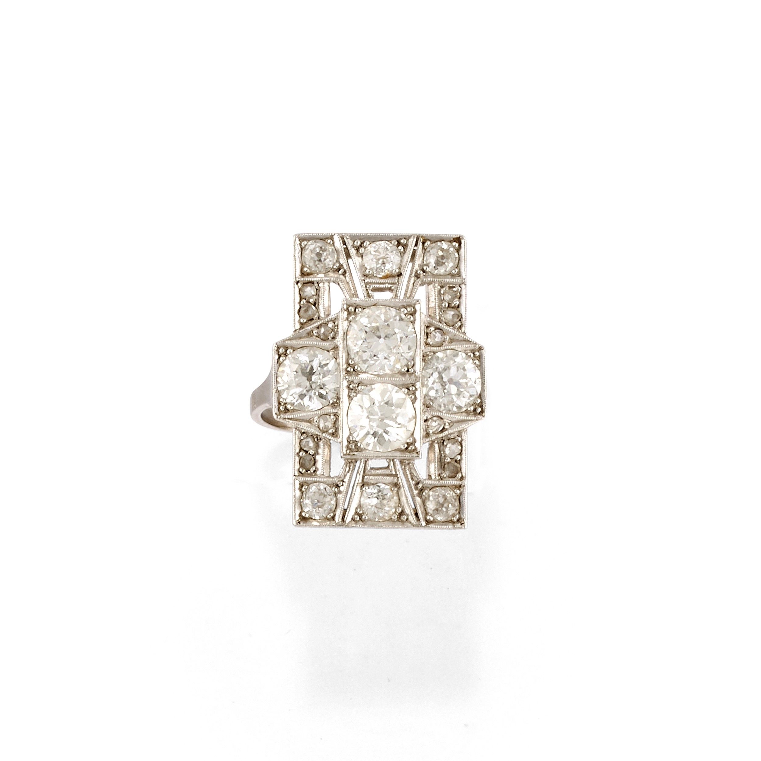 1930 circa sommità rettangolare trattenente quattro diamanti taglio vecchio per totale ct 2,50 circa, diamanti taglio huit-huit e vecchio a decoro.