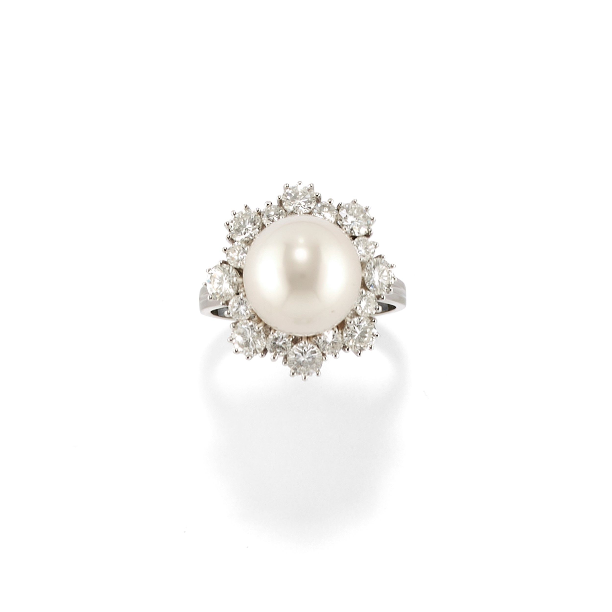 a fiore con perla coltivata South-Sea di mm 11,50 circa, diamanti taglio brillante per totale ct 2,00 circa.