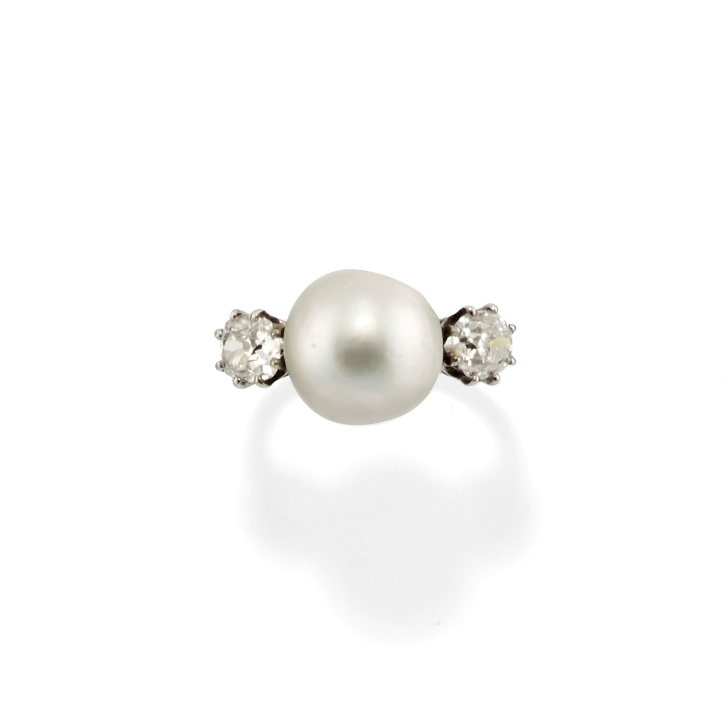 di acqua salata di ct 7,15 circa di forma a bottone con ai lati due diamanti taglio vecchio per totale ct 1,20 circa.