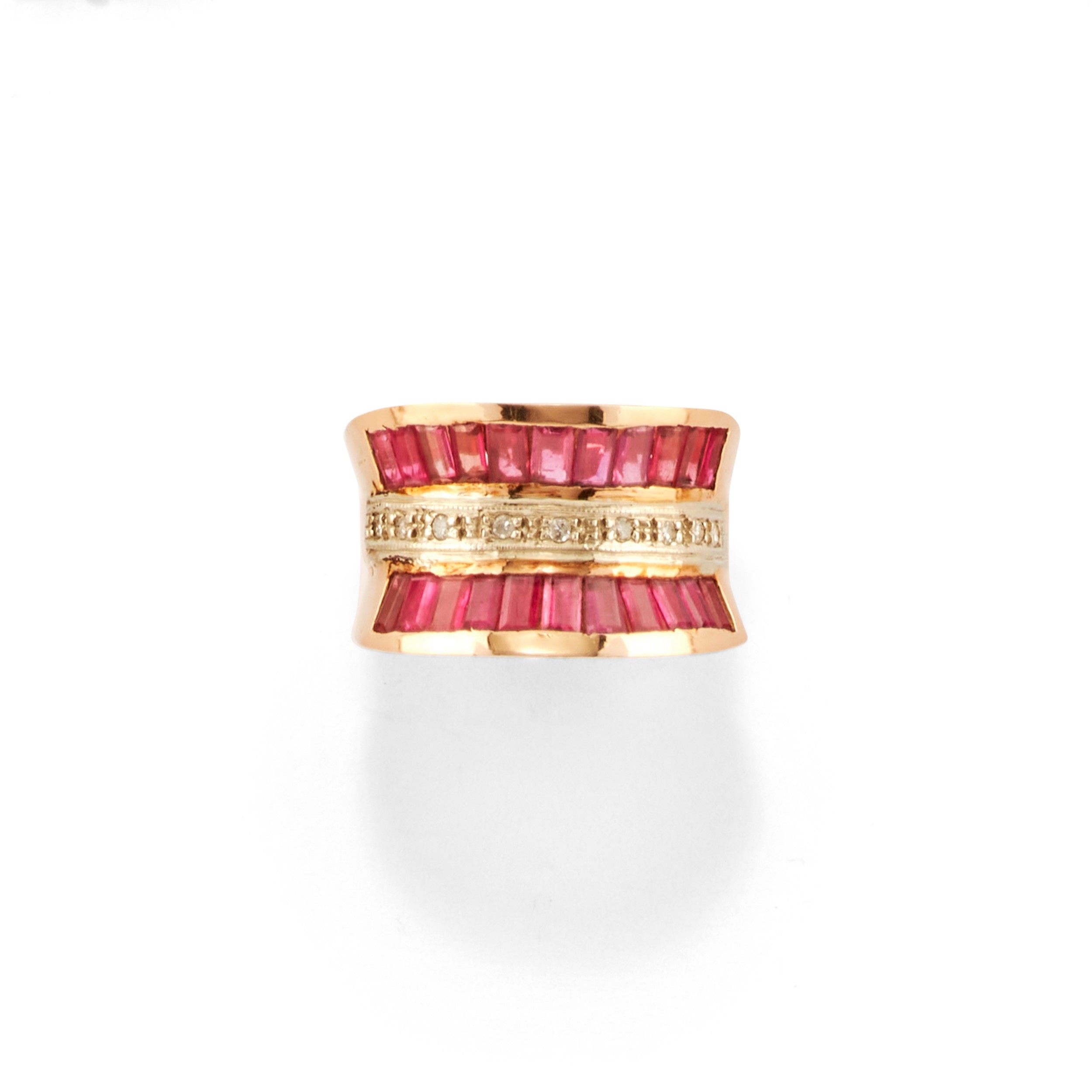 in stile decò con settore centrale in diamanti taglio huit-huit ed ai lati rubini taglio baguette.