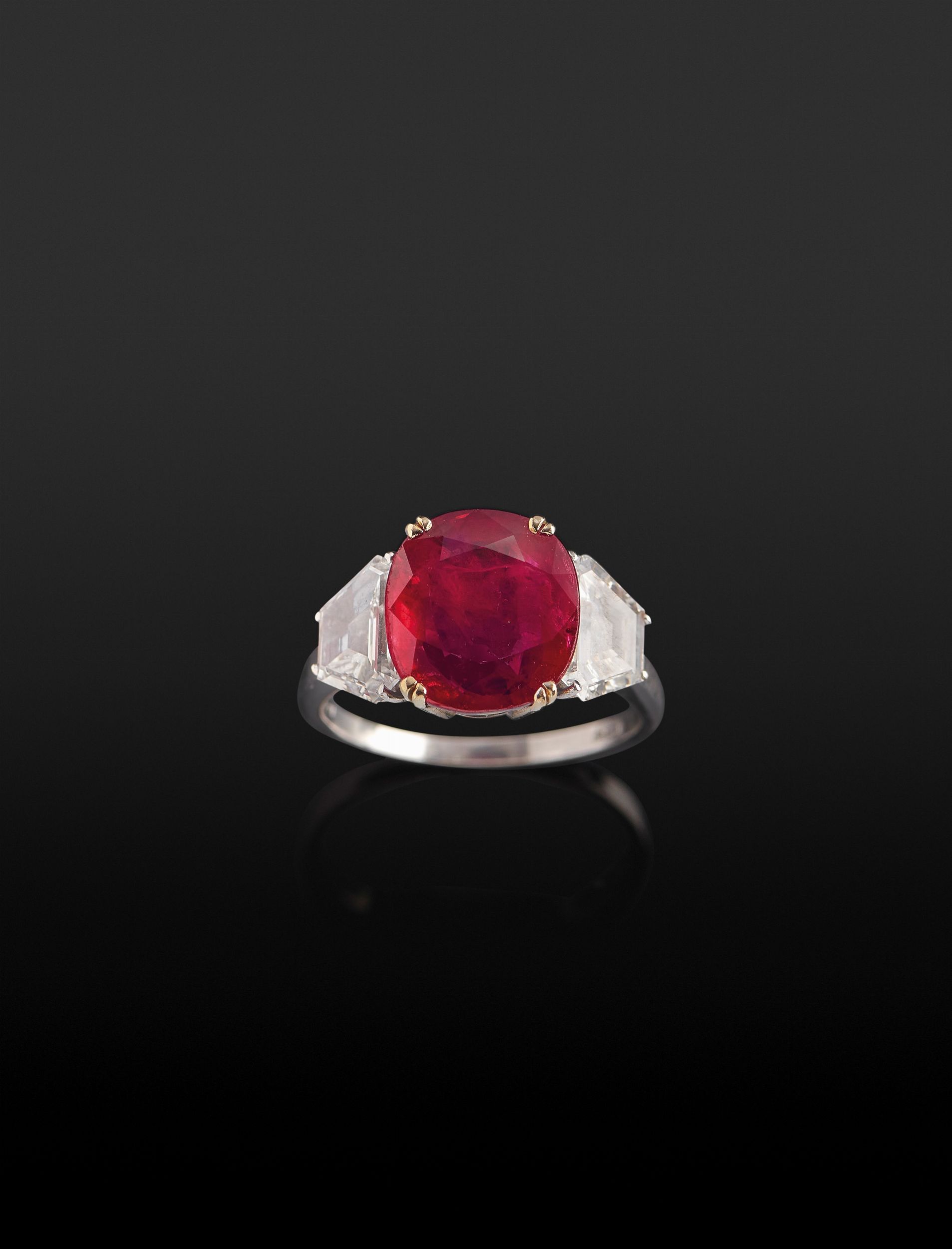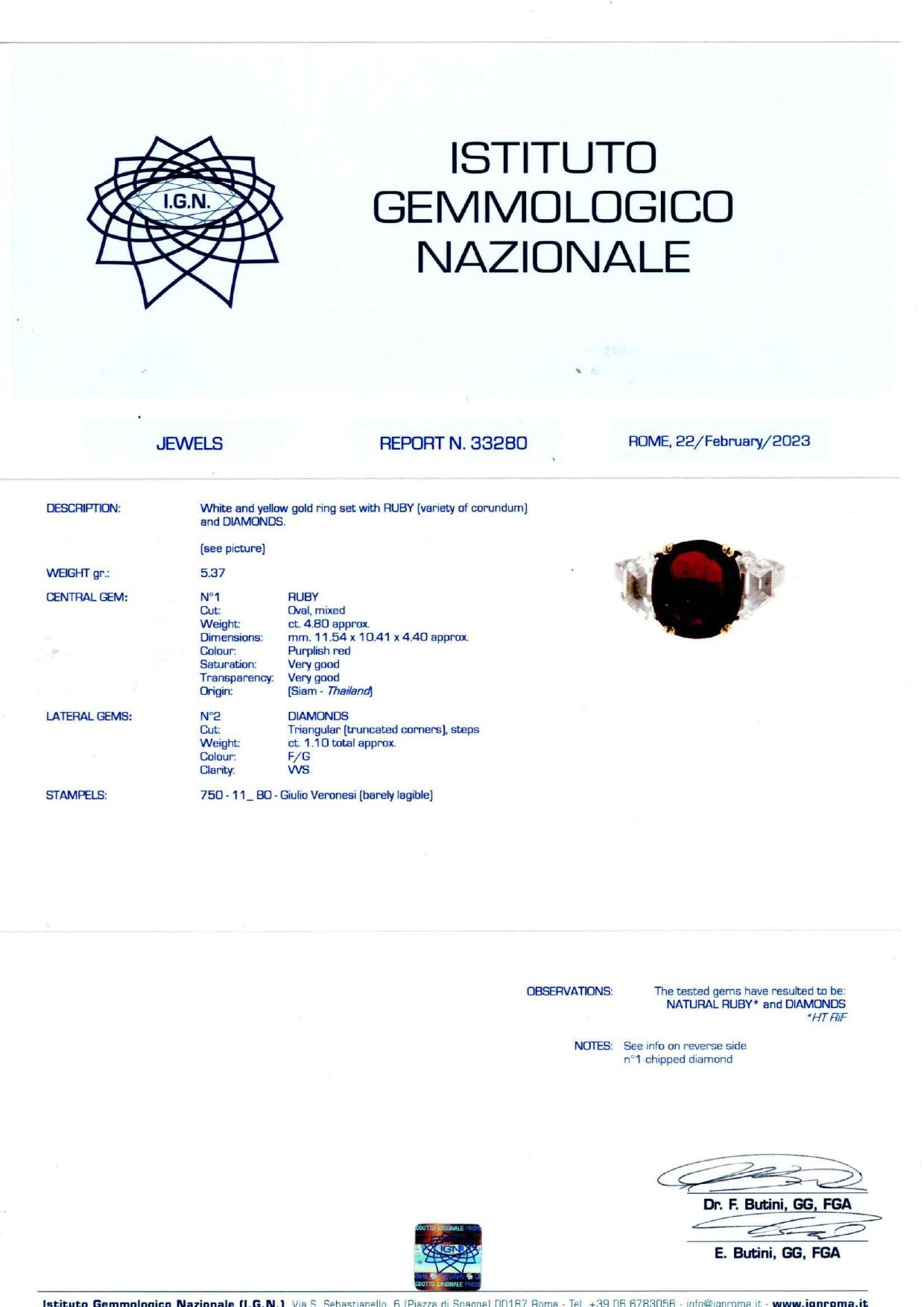 rubino Siam taglio ovale di ct 4,80 e diamanti taglio triangolare per totale ct 1,10 circa, prob. colore F/G, purezza VVS.