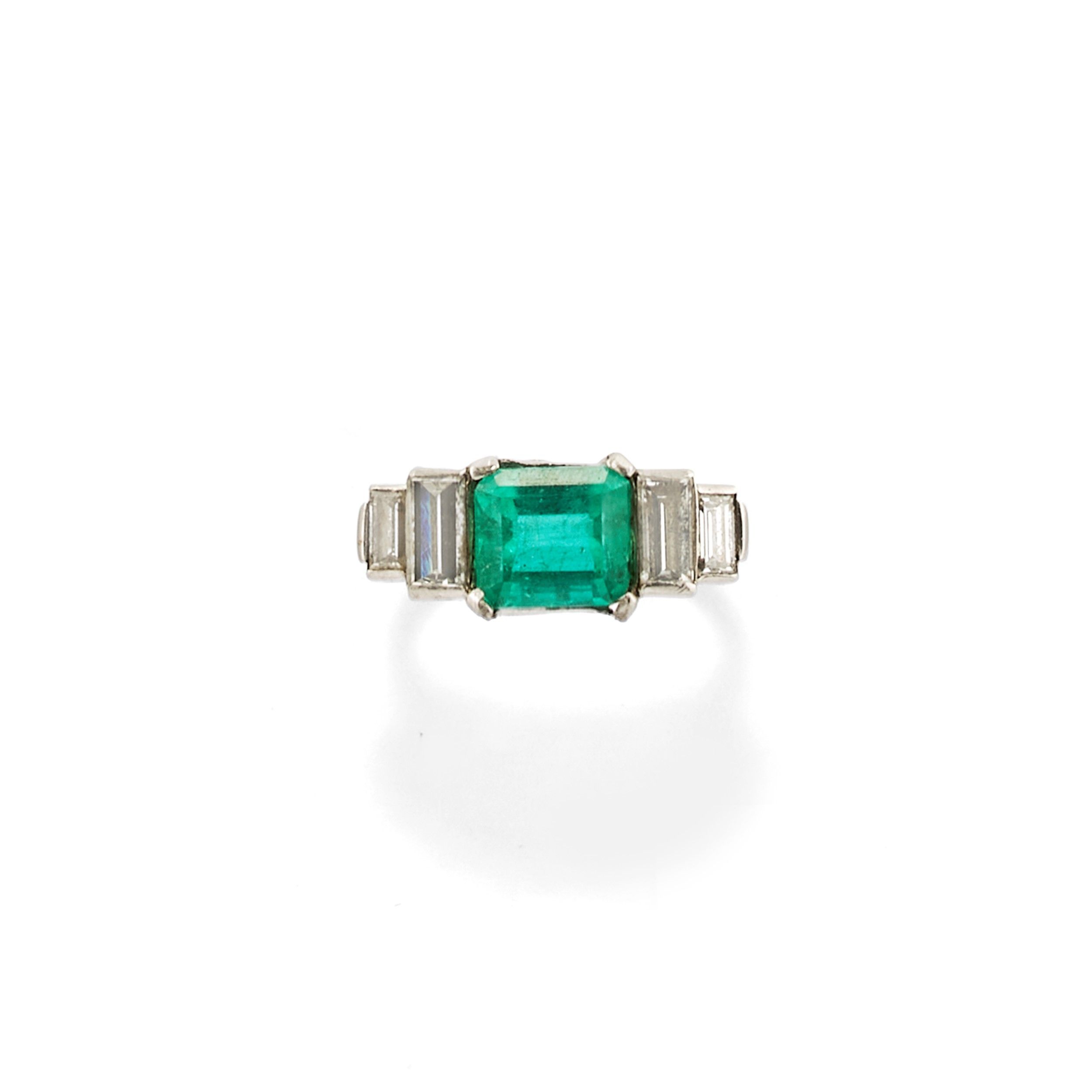 al centro smeraldo taglio rettangolare a contorto ottagonale di ct 2,00 circa ed ai lati diamanti taglio baguette per totale ct 0,60 circa.