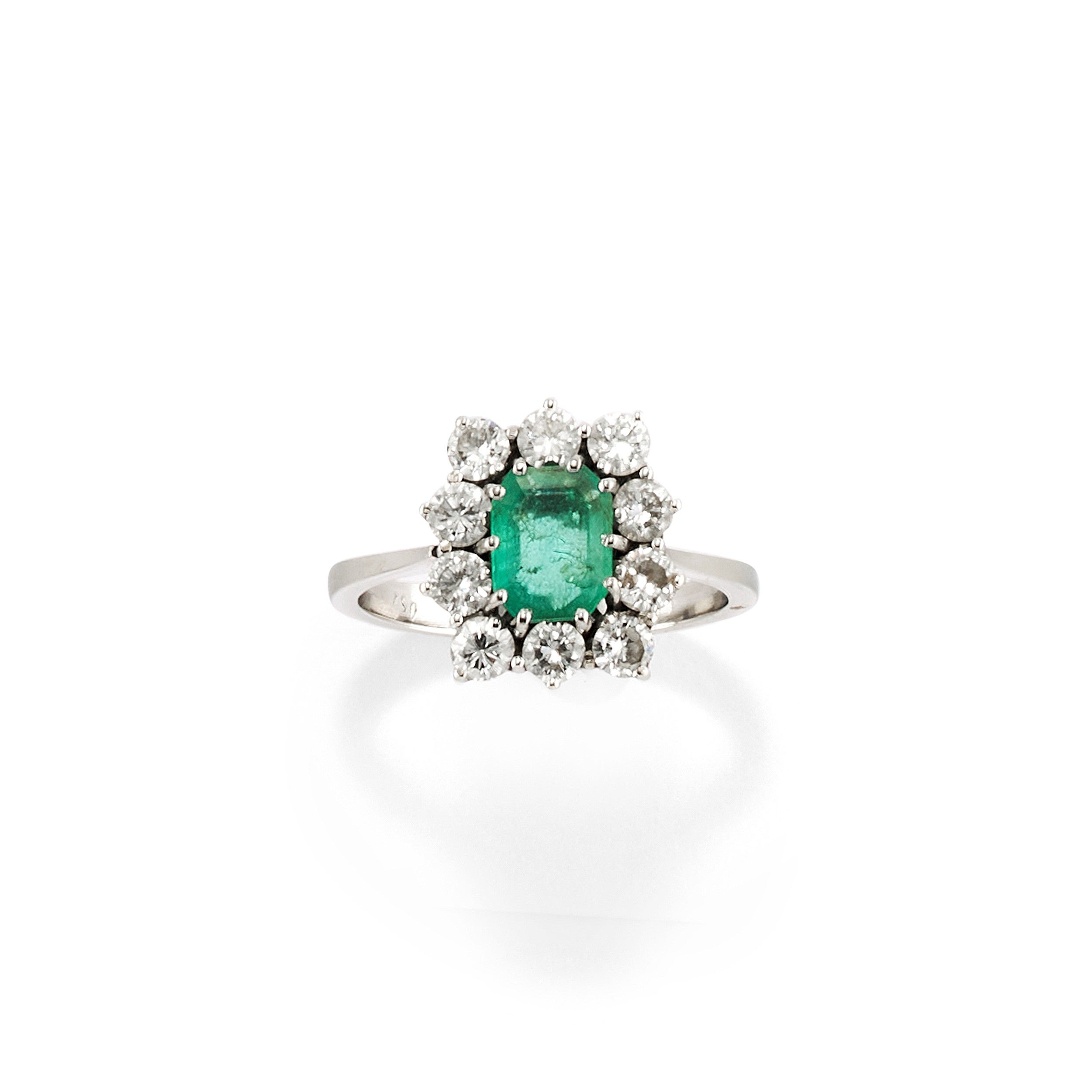 al centro smeraldo taglio rettangolare a contorno ottagonale di ct 1,00 circa entro giro di diamanti taglio brillante per totale ct 0,70 circa.
